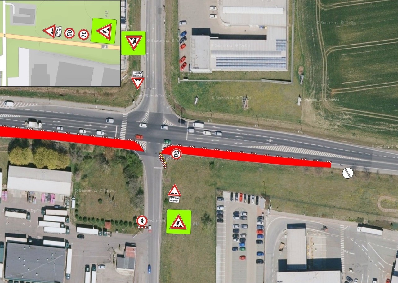 Po celou dobu prací bude doprava v místě ovlivněna pouze částečně a průjezd křižovatkou bude umožněn ve všech směrech. Semafory budou po celou dobu v provozu. Doporučujeme motoristům sledovat přechodné dopravní značení viz. obrázek níže.