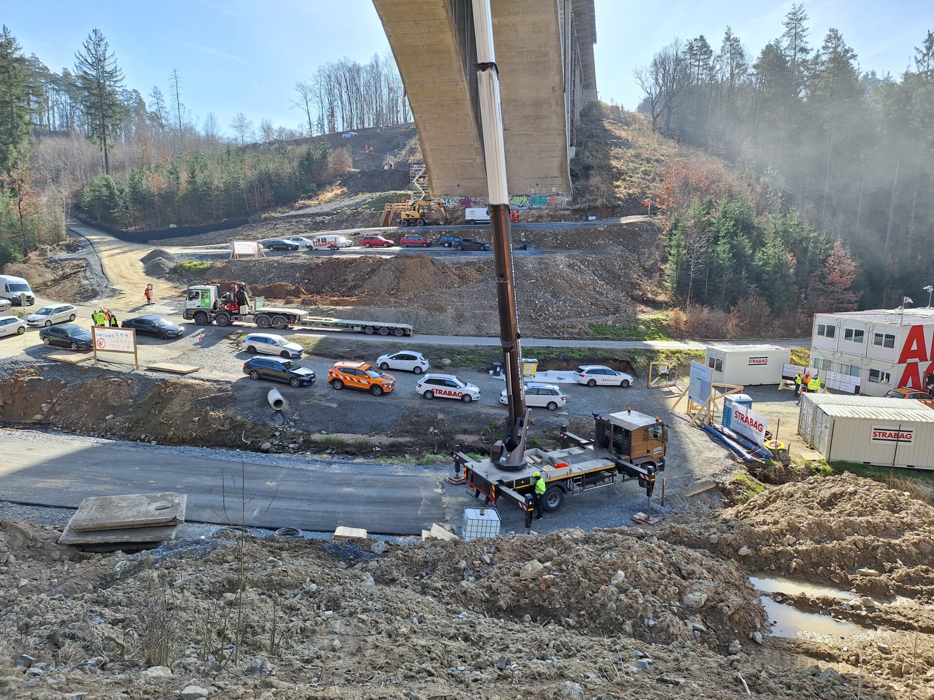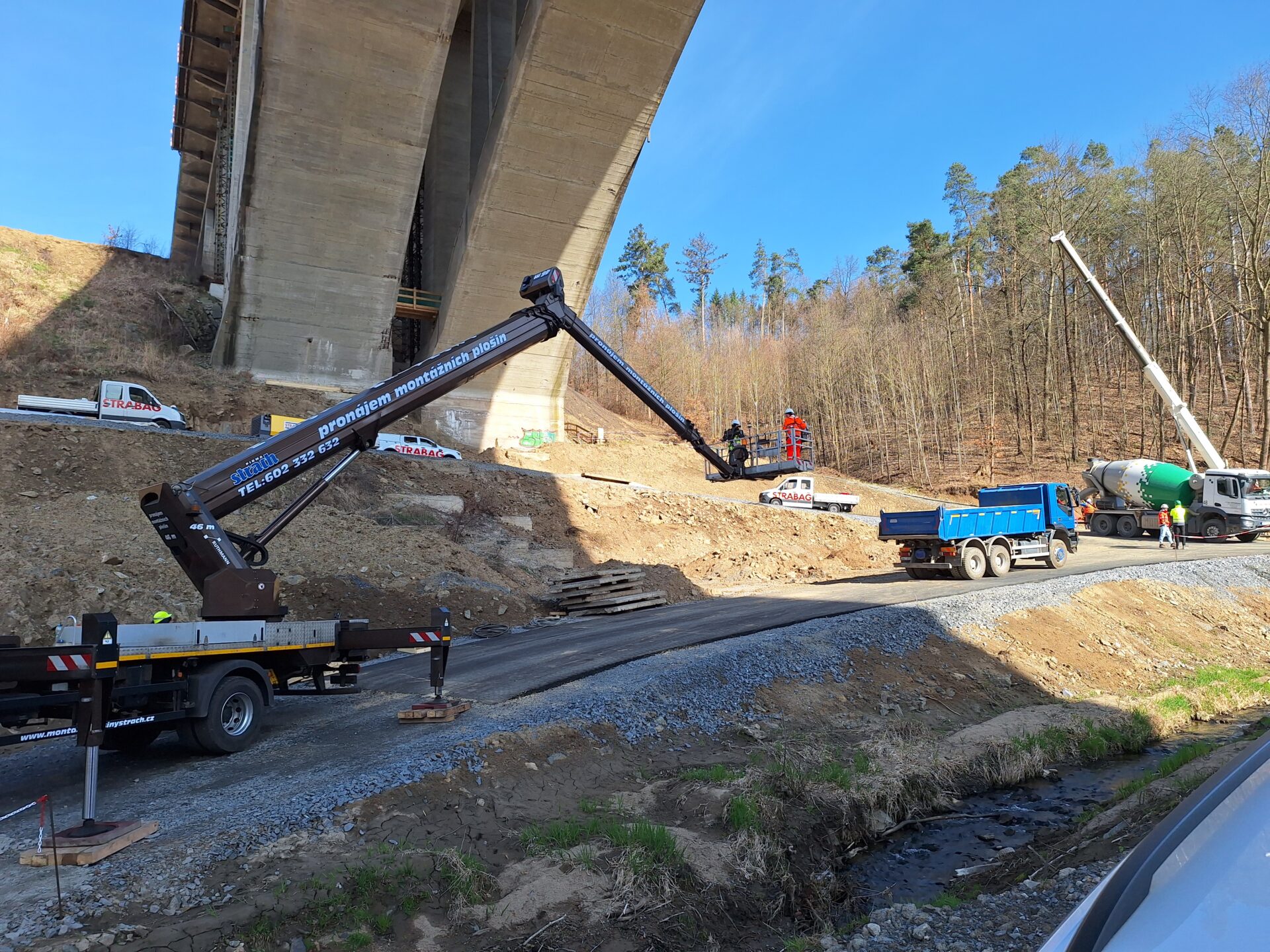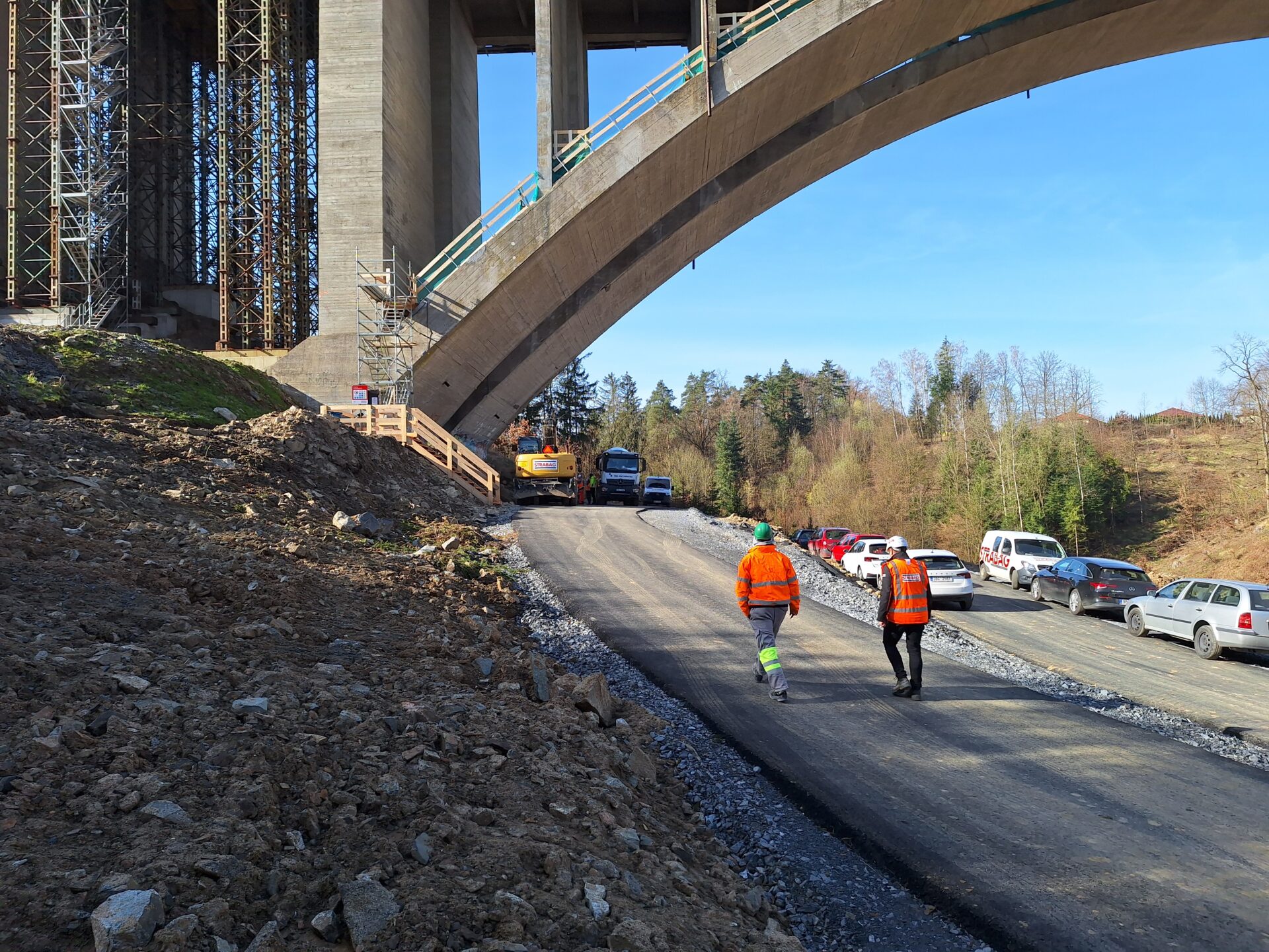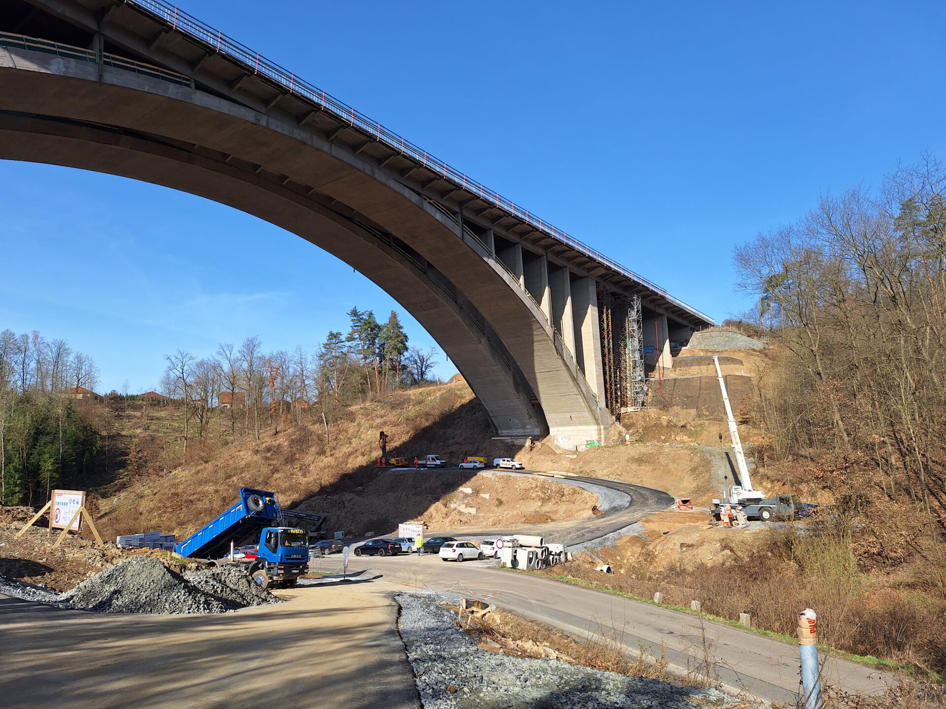 Zatím se veškeré práce soustřeďují pod mostem. Zde se mimo jiné budují obslužné komunikace pro stavbu v celkové délce 1523 m, včetně systému odvodnění.