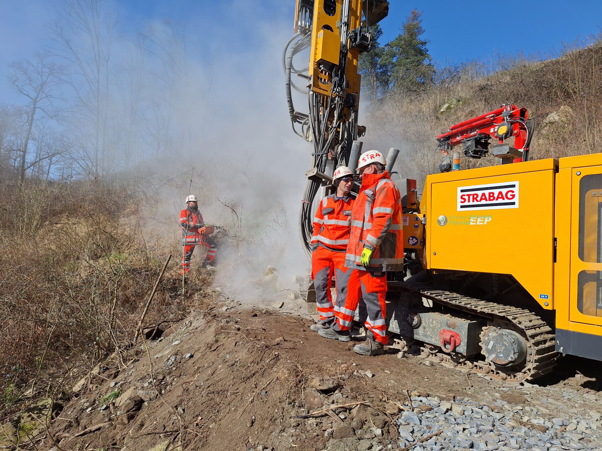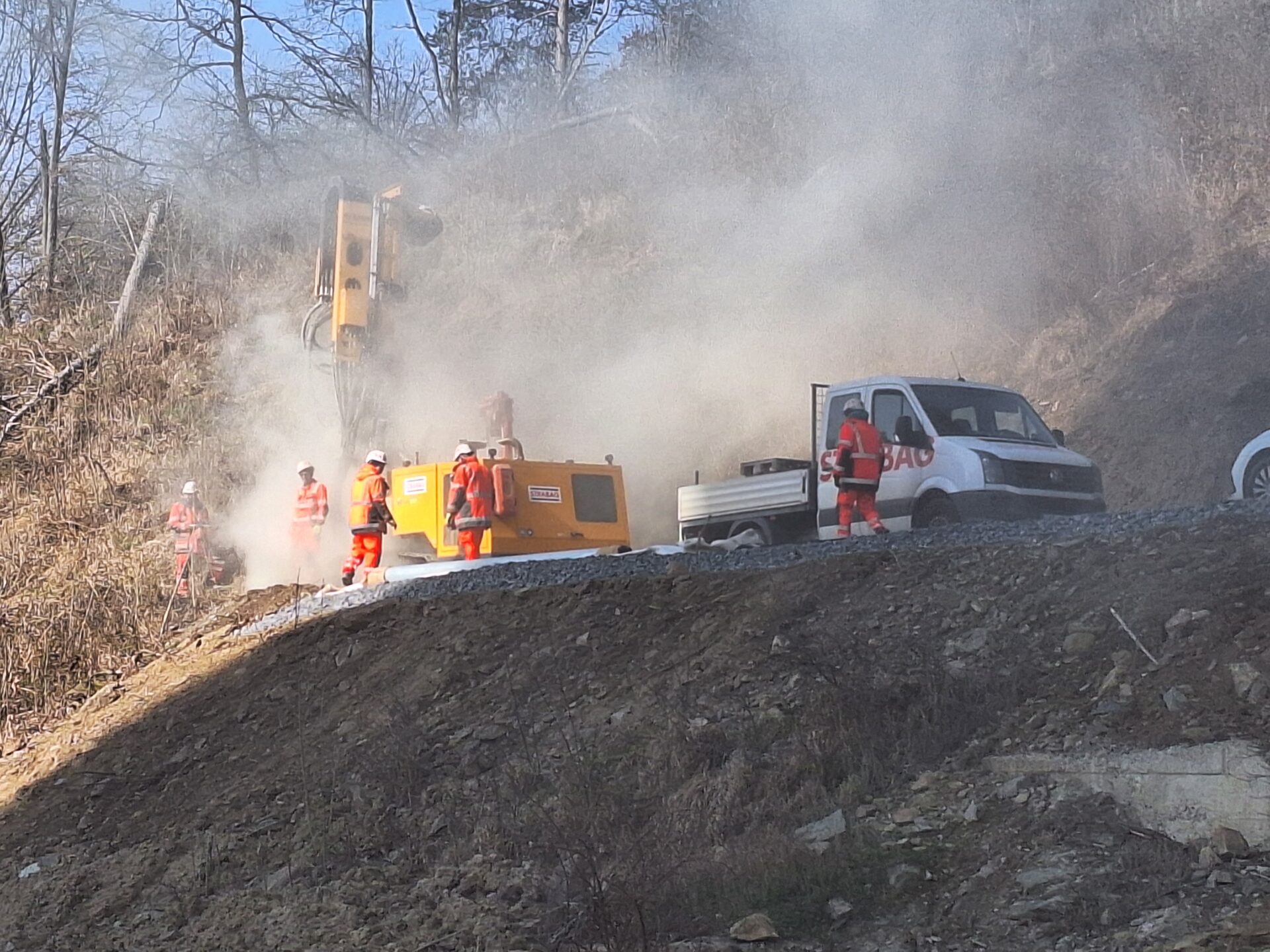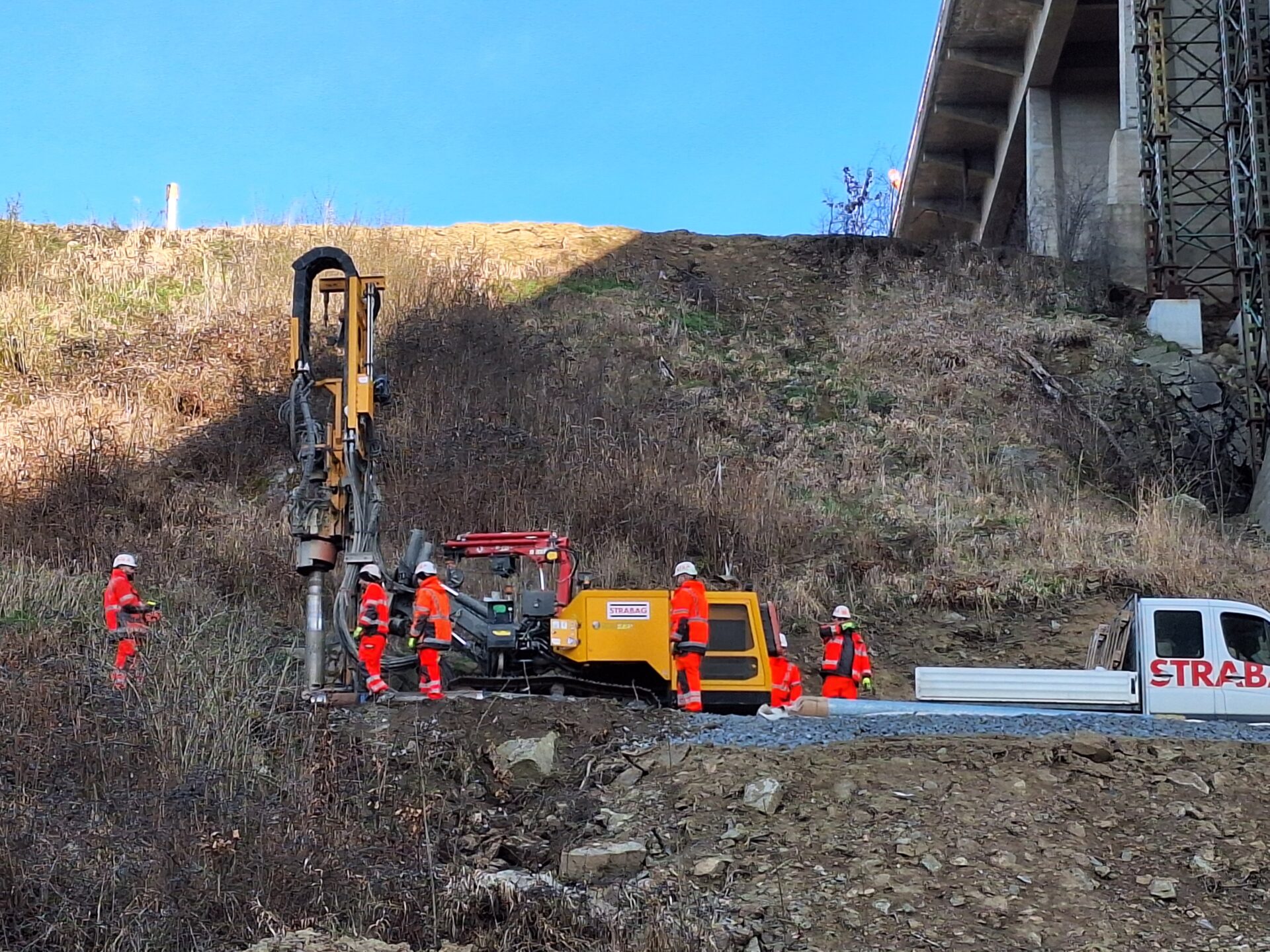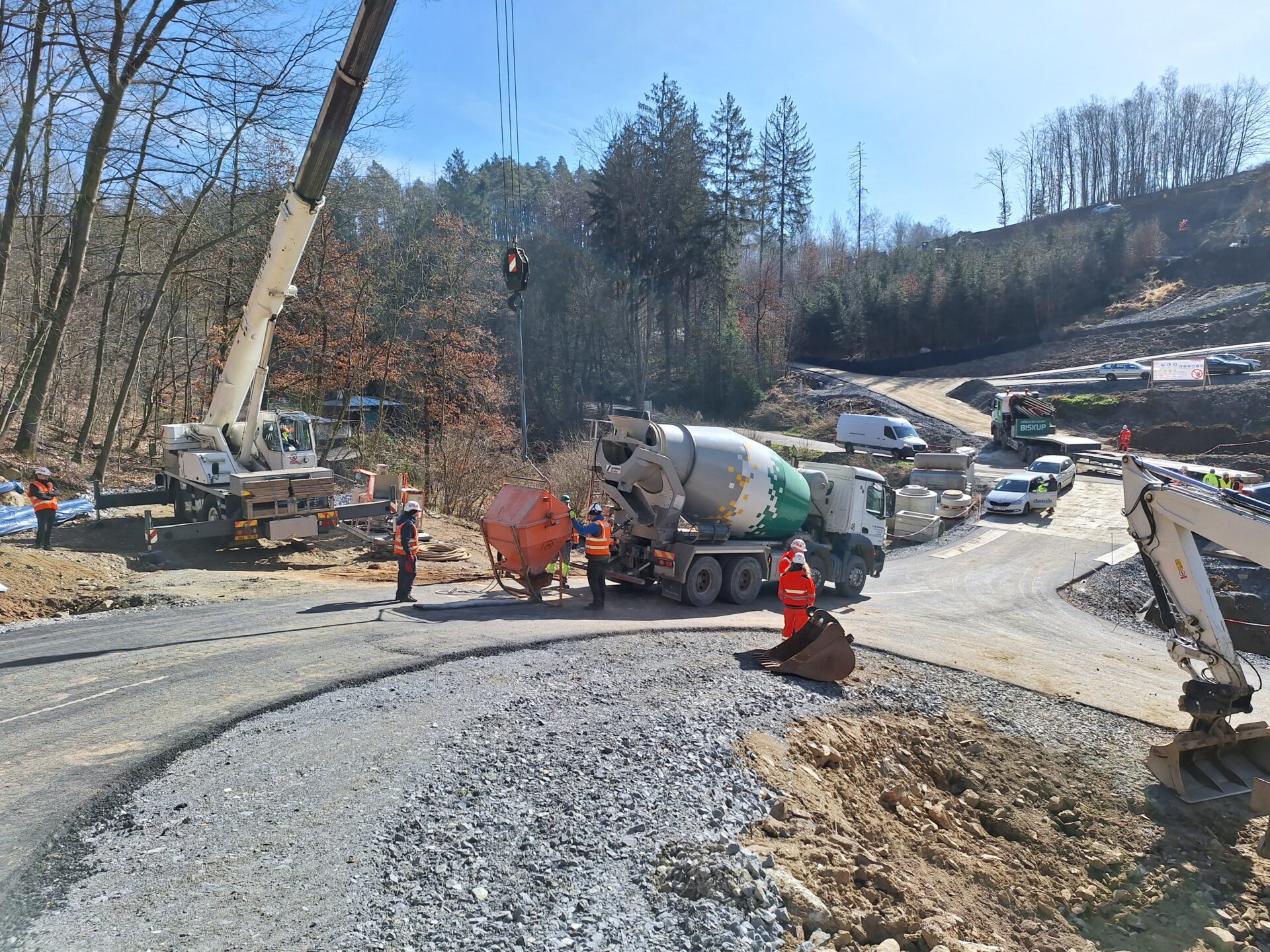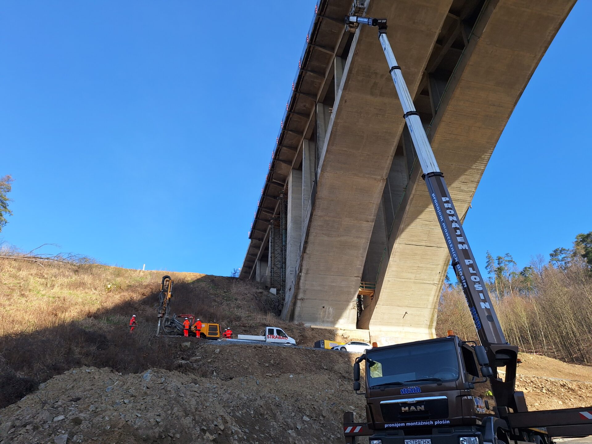Zatím se veškeré práce soustřeďují pod mostem. Zde se mimo jiné budují obslužné komunikace pro stavbu v celkové délce 1523 m, včetně systému odvodnění.