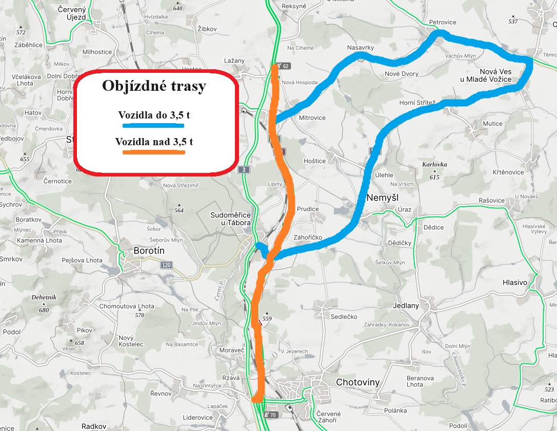 Práce bude provázet úplná uzavírka silnice I/3 v místě stavby. Objízdné trasy jsou navrženy pro vozidla do 3,5 t po silnicích nižších tříd přes Mitrovice, Nové Dvory, Novou Ves u Mladé Vožice a Nemyšl do Sudoměřic u Tábora. Pro vozidla nad 3,5 t bude objízdná trasa vedena po dálnici D3 v rozsahu mezi exity km 62 a km 70. Dálnice D3 bude rovněž využita pro objízdnou trasu autobusové dopravy. Pro otáčení autobusů jsou vymezena vhodná místa na točně v blízkosti železniční stanice Mezno a v Sudoměřicích u Tábora přes obslužnou komunikaci u obecního úřadu a prodejny COOP.