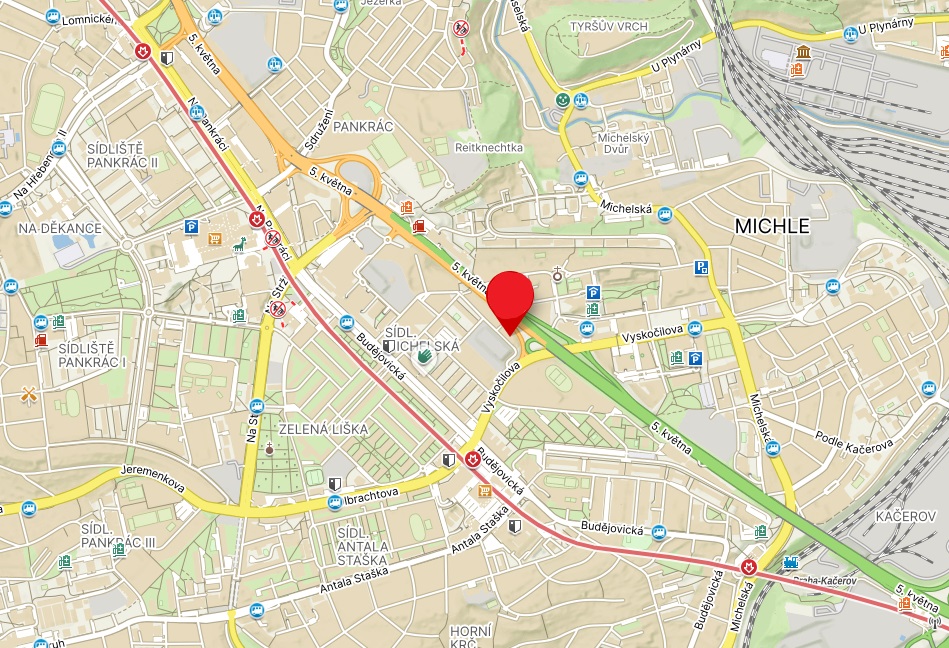 Pro návštěvy, které přijedou automobilem, jsou k dispozici parkovací místa jak před samotnou budovou, tak v podzemním parkovišti. Pro návštěvy přijíždějící MHD je v blízkosti nových prostor dostupná stanice metra Budějovická (trasa C) nebo autobusová zastávka Brumlovka, pěší chůzí cca 5 minut.