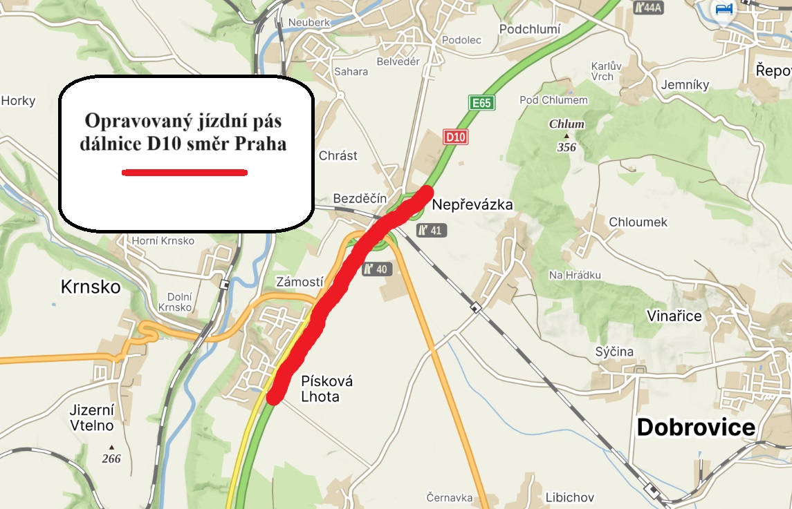 Po celou dobu bude provoz na dálnici D10 omezen jen částečně a veden v režimu 2/2 zúžené jízdní pruhy. Rychlost v místě prací bude snížena na 80 km/h maximálně. Od 25.8. do 17.9. bude uzavřen EXIT 41 směr Praha, od 18.9. do 24.9. pak EXIT 39 směr Praha. Tedy vždy jeden z těchto blízkých exitů bude otevřen.