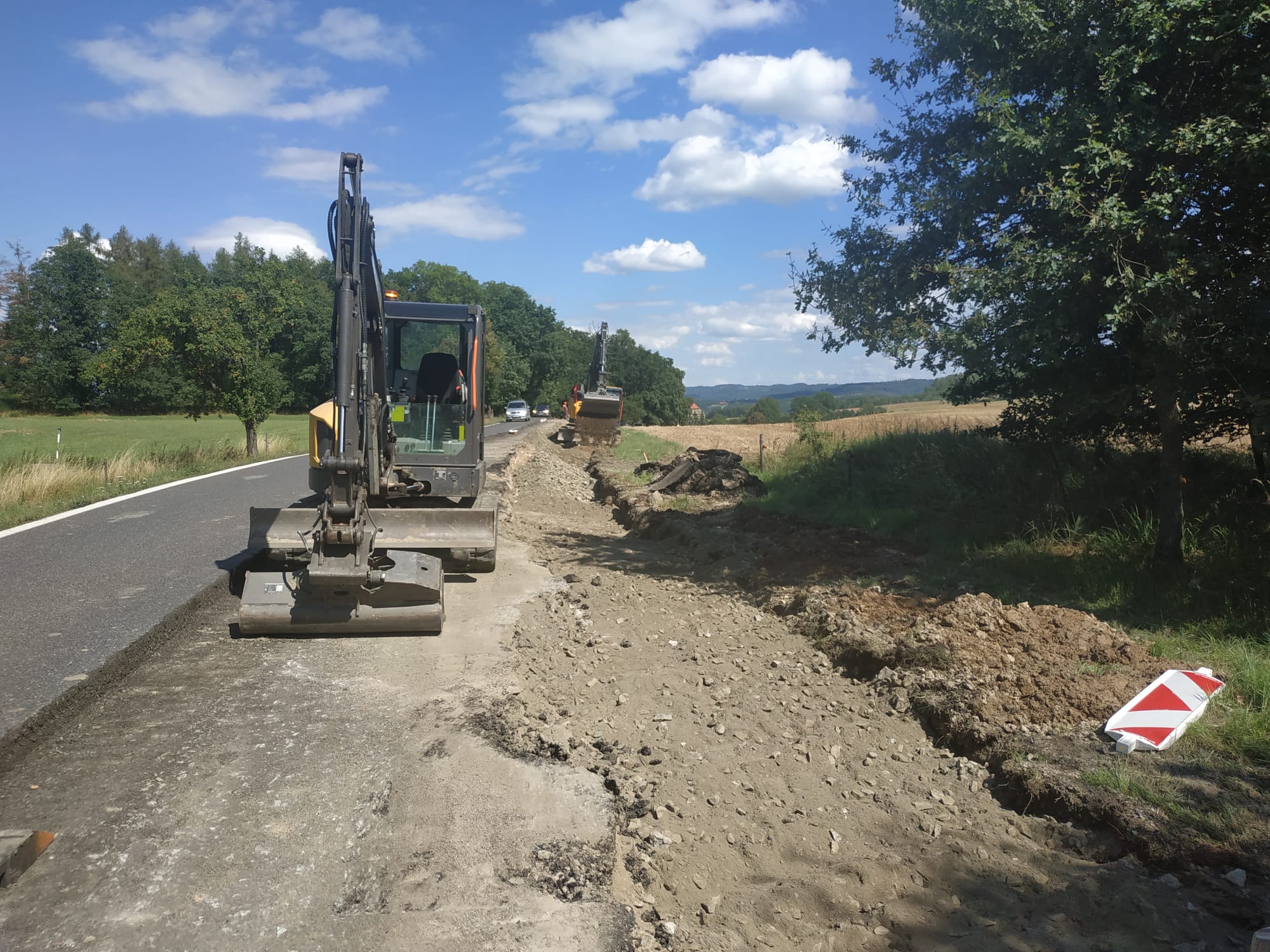Aktuálně se síly i prostředky soustřeďují u Vojkova a Vrchotových Janovic, tedy v krajních mezích rekonstruovaného úseku. Na tři desítky dělníků pracují na odstranění živičného krytu vozovky, sanaci konstrukčních a podkladních vrstev, úpravě nezpevněných krajnic, či hloubení příkopů a obnově systému odvodnění.