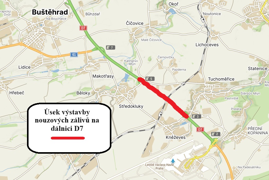 Na dálnici D7 na trase Kněževes – Středokluky, chystáme výstavbu nouzových zálivů. Vznikne jich dohromady 12, po šesti na každé straně dálnice.
