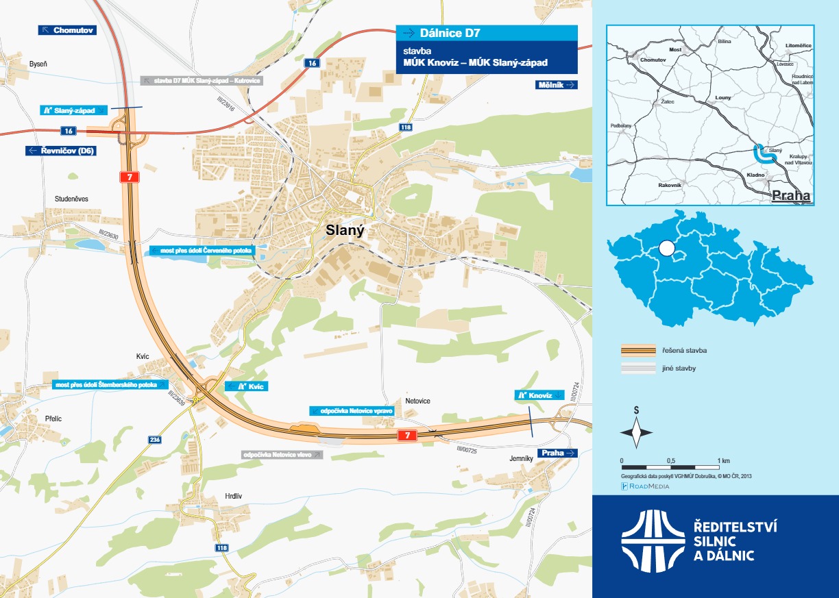 Stavba D7 MÚK Knovíz – Slaný-západ je součástí souboru staveb, jejichž cílem je zkapacitnění stávající dvoupruhové silnice I/7 na čtyřpruhovou dálnici D7.