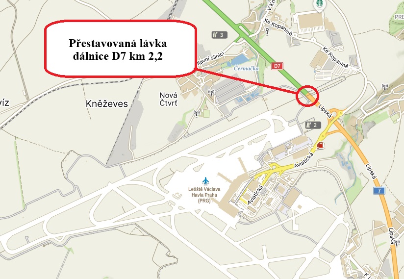 Na dálnici D7 v km 1,3 provozního staničení letos plánujeme celkovou rekonstrukci lávky pražského letiště Václava Havla. Aktuálně probíhá výběrové řízení na zhotovitele.
