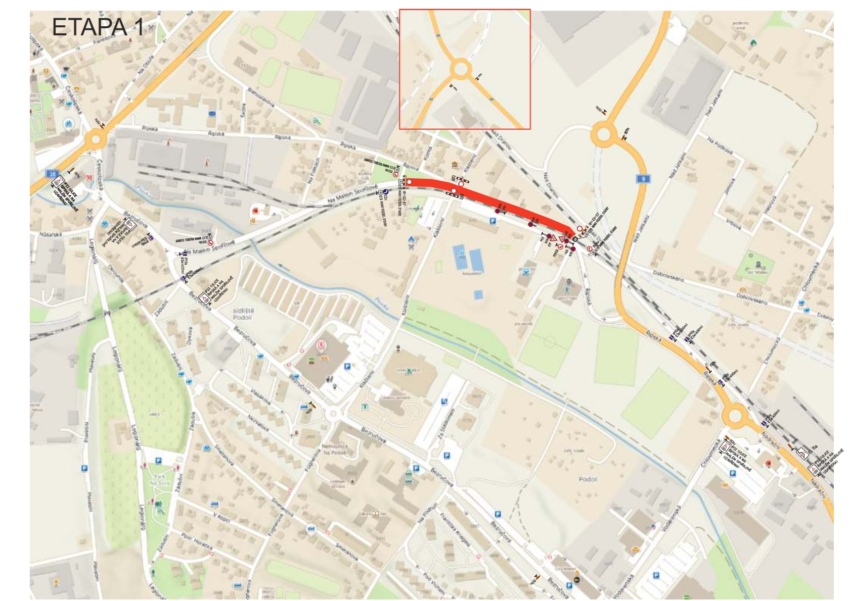Uzavřený úsek: silnice č. I/9 J, v km staničení cca 0,000 – 0,700, ulice Řípská a ulice Na Malém Spořilově, město Mělník.