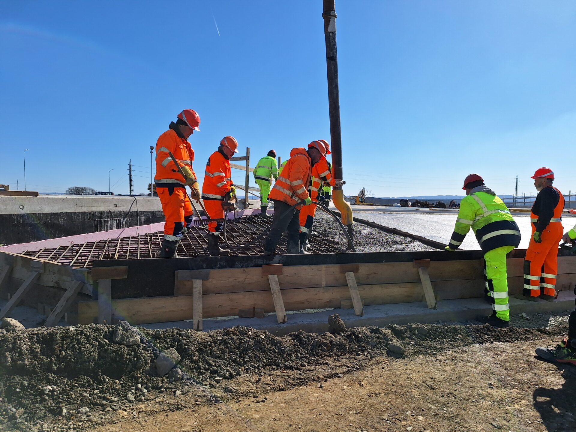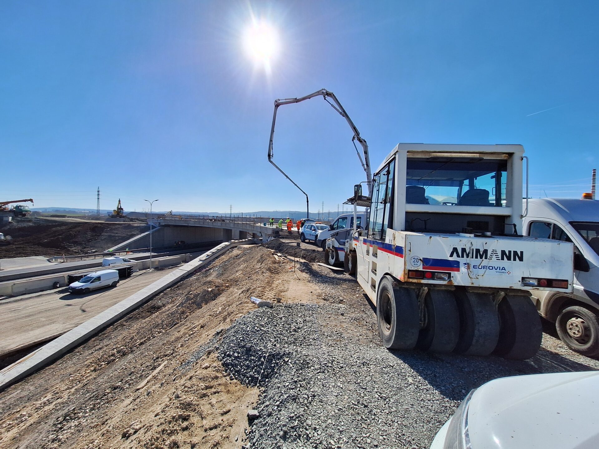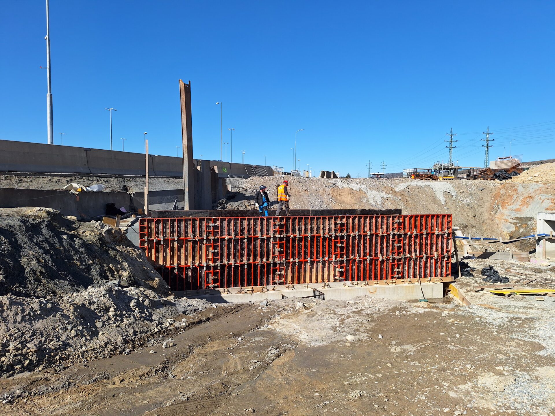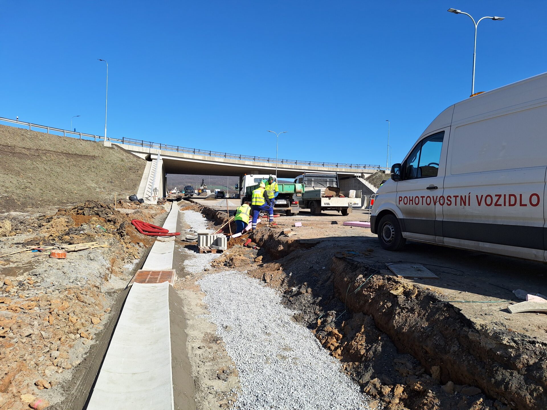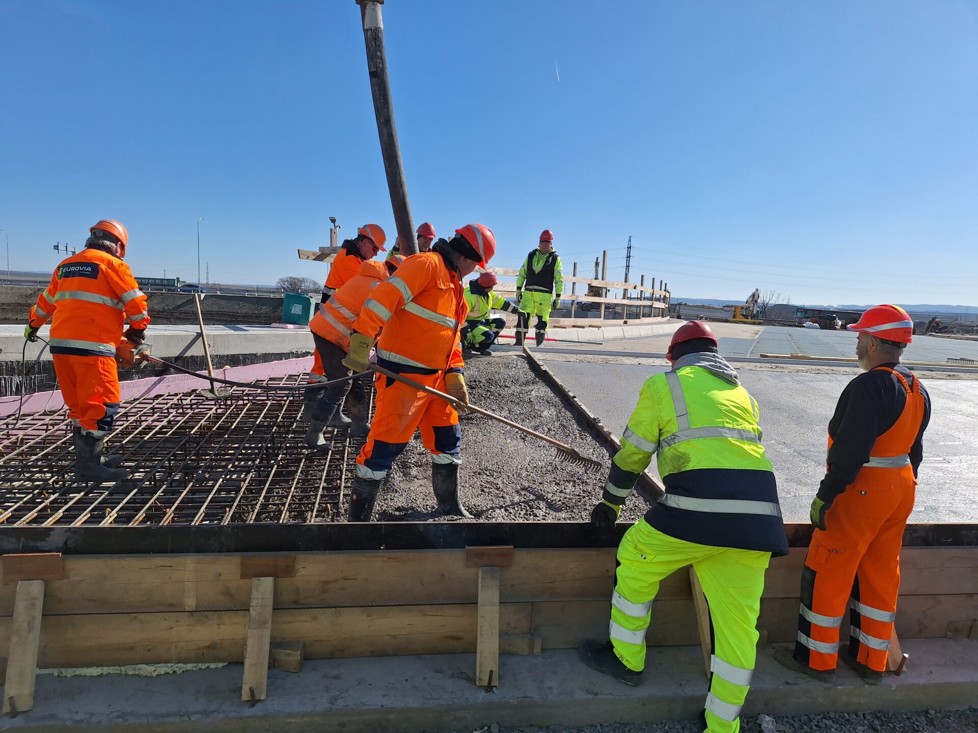 Příznivější počasí nyní umožňuje provádět veškeré naplánované práce. Denně se na nich podílí až 100 dělníků, kterým je k dispozici množství těžké techniky, bagry, jeřáby, domíchávače, nákladní vozidla a další potřebná výbava. Práce probíhají na několika frontách současně. Jde například o betonáž přechodové desky u posledního z mostních objektů, který tvoří jeden ze segmentů budoucí okružní křižovatky nad dálnicí. Instalována je kabeláž veřejného LED osvětlení, kterým bude prostor křižovatky nasvícen. Jednou z dílčích operací je rovněž budování komplexního systému odvodnění. To mimo jiné zahrnuje i drenáže a žlaby umístěné podél tělesa dálnice. Mohutnými jeřáby jsou instalovány portály a poloportály nad dálnicí, které ponesou informativní dopravní značky navádějící řidiče do jednotlivých směrů. Od půlky dubna je v plánu pokládka asfaltového souvrství na přibližně 300 metrech jízdního pásu dálnice směr Praha, v prostoru přestavované mimoúrovňové křižovatky.