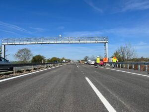 Větší část zařízení vysokorychlostního vážení (WIM) už se v rámci 1. etapy podařilo instalovat. Jde především o čidla umístěná ve vozovce, kterou jsme kvůli tomu museli odfrézovat a znovu položit asfaltové souvrství. V uplynulých dnech jsme obnovili vodorovné dopravní značení a upravili prostor středního dělícího pásu. Práce nyní pokračují navazující 2. etapou, instalací další části zařízení na portálu.