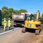 Výstavba započala zemními pracemi, kdy je v místech plánovaných 6 nouzových zálivů, po třech na každé straně dálnice, rozšiřován prostor vedle dálničního tělesa. Probíhá odtěžení zeminy ze svahů u dálnice a její svážení na deponii. Zároveň započalo frézování krajnice do hloubky 4 cm, aby na ni mohly být zálivy plynule napojeny. Plán rovněž zahrnuje vybudování systému odvodnění.