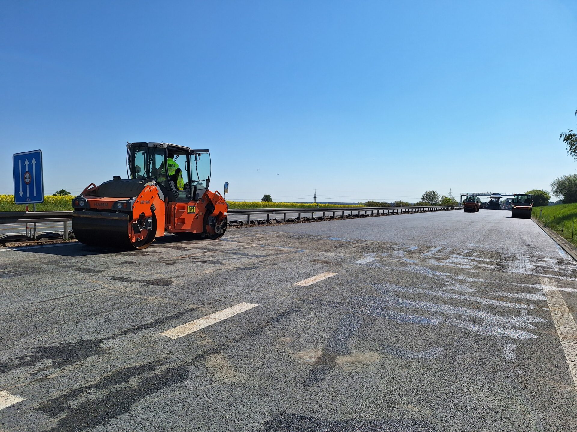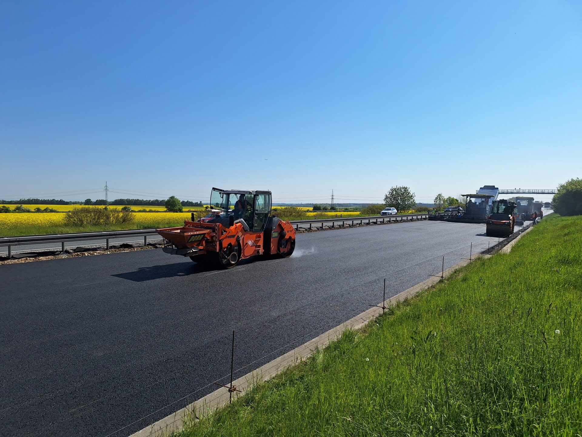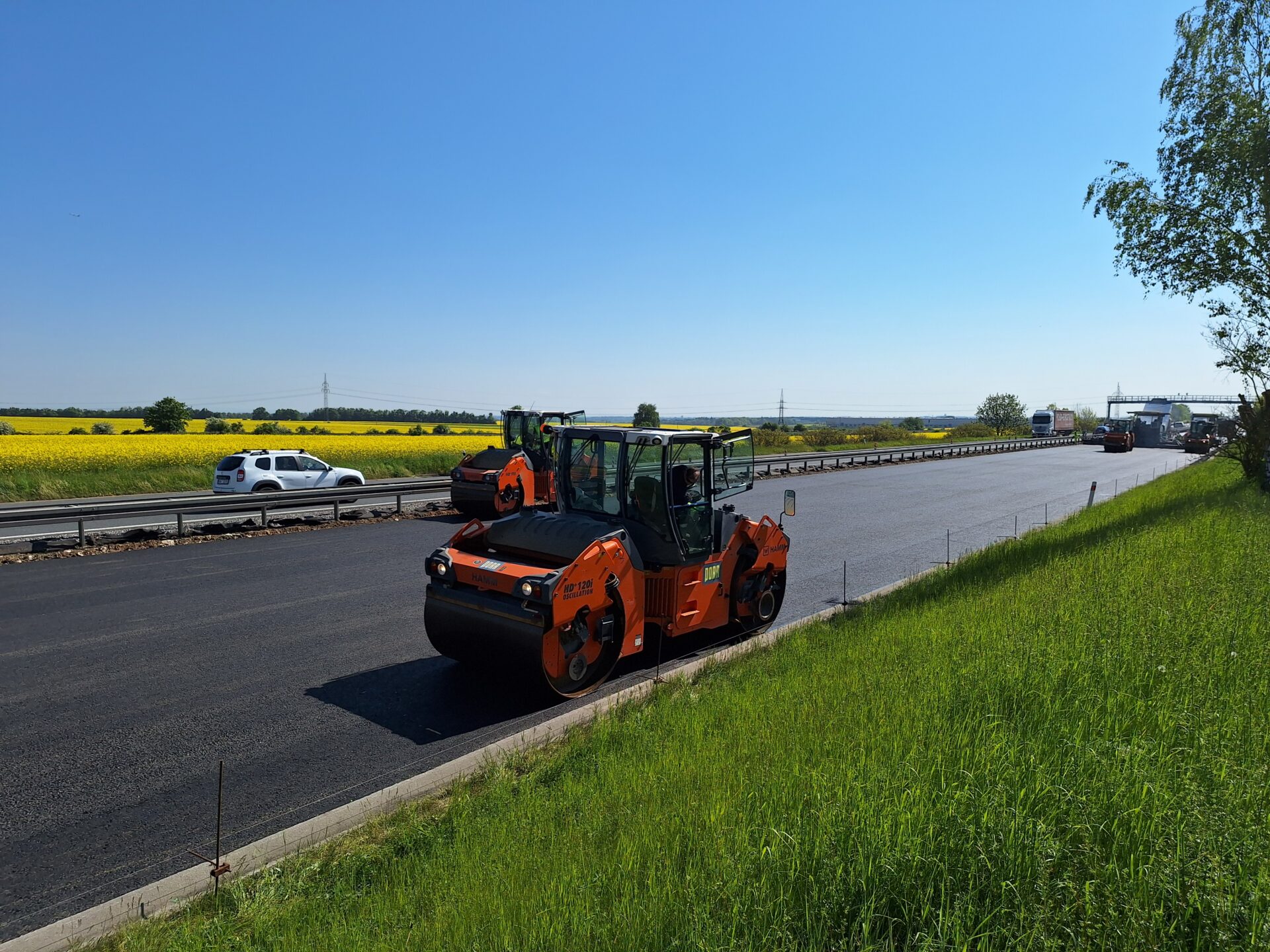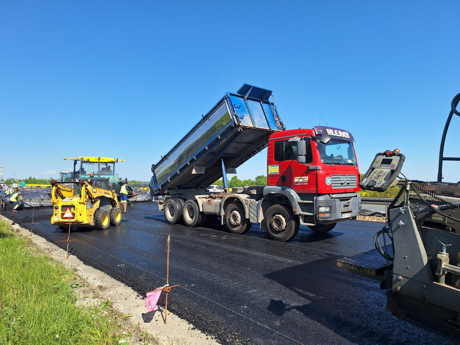 Aktuálně pokládáme nové asfaltové souvrství v jízdním pásu směr Praha. Část snímačů jsme totiž umístili do vozovky, stejně jako minulý měsíc v opačném směru. Na stavbě je velký pohyb těžké techniky, nákladní auta, finišery, válce, proto je jízdní pás směr Praha v místě instalace uzavřen. Doprava je nyní vedena v režimu 2+1 jízdní pruh. Ve směru na Prahu jsou řidičům k dispozici dva jízdní pruhy, ve směru na Karlovy Vary jeden.