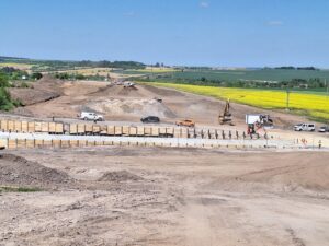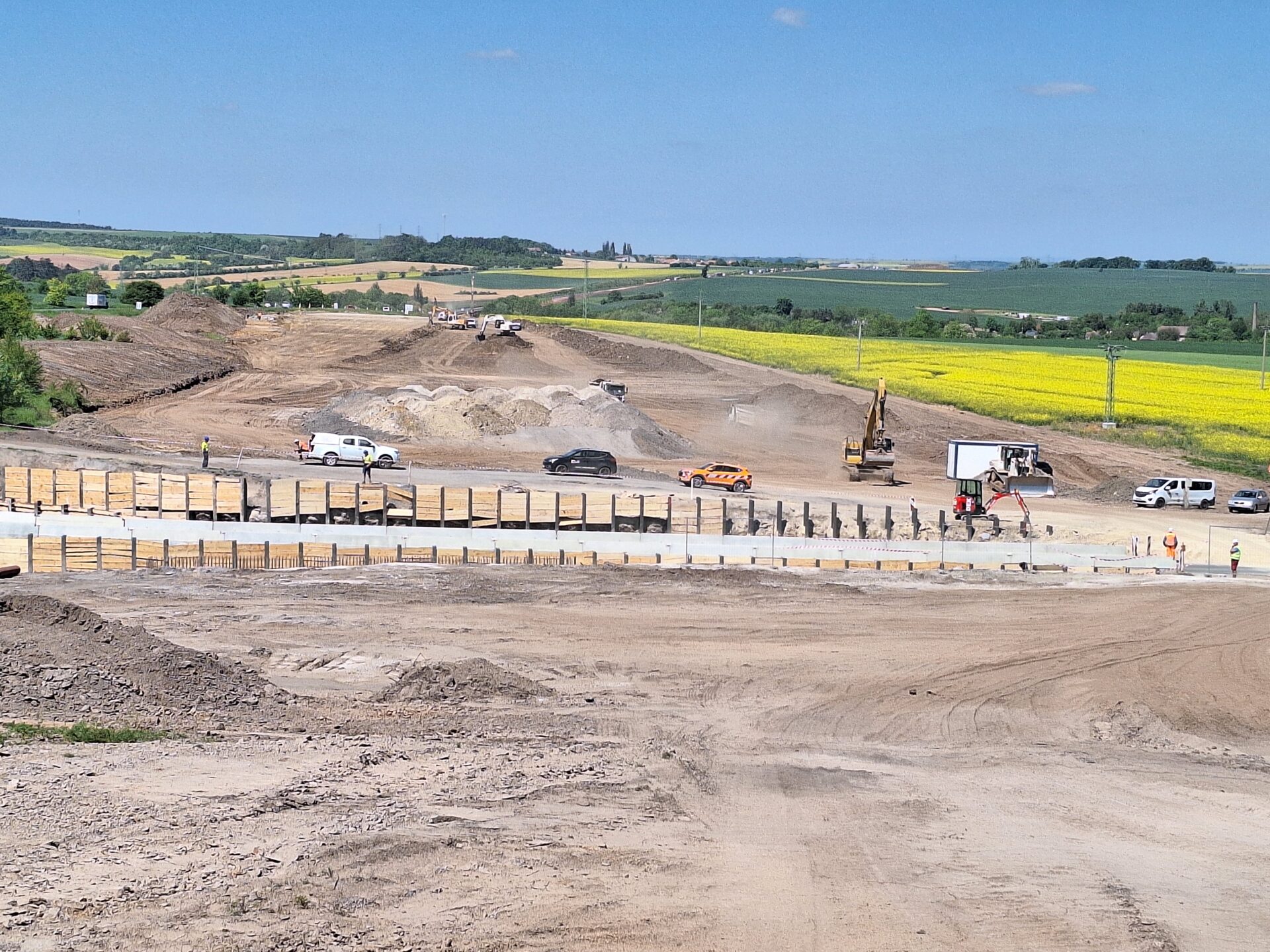 Za příznivého počasí pokračujeme s dostavbou středočeské části dálnice D7 mezi městysem Panenský Týnec a obcí Knovíz s celkovou délkou bezmála 16 734 m km. Denně se na ní podílí na 200 dělníků a obrovské množství těžké techniky, včetně vrtacích souprav. Trasa je rozdělena na 3 úseky. A to Knovíz – Slaný, Slaný Kutrovice a Kutrovice – Panenský Týnec. V celé délce stavby probíhají nadále intenzivní zemní práce. Pracujeme nejen na přeložkách inženýrských sítí, ale i na skrývce ornice v místech, kudy přímo povede těleso dálnice s veškerým příslušenstvím. Největší posun je možné vidět na úseku Slaný – Kutrovice, kde pracujeme na zemní pláni a dokončili jsme přeložku plynovodu v délce 500 m od Lotouše směr Chomutov. Teď pokračujeme s přeložením plynovodu délky 800 m ve směru od Lotouše na Prahu. Na tomto úseku budoucí dálnice už také zakládáme 3 mosty. Právě tento úsek mezi Slaným a Kutrovicemi chceme zprovoznit už v příštím roce, zbylé dva pak hned rok na to. Upozorňujeme řidiče, že v celé délce stavby je doprava na původní silnici I/7 částečně omezena a provoz je veden dvěma zúženými jízdními pruhy. S postupem stavby budou omezení upravována, a tak doporučujeme zejména svátečním řidičům si před cestou ověřit konkrétní dopravní omezení na našem informačním portálu www.dopravniinfo.cz
