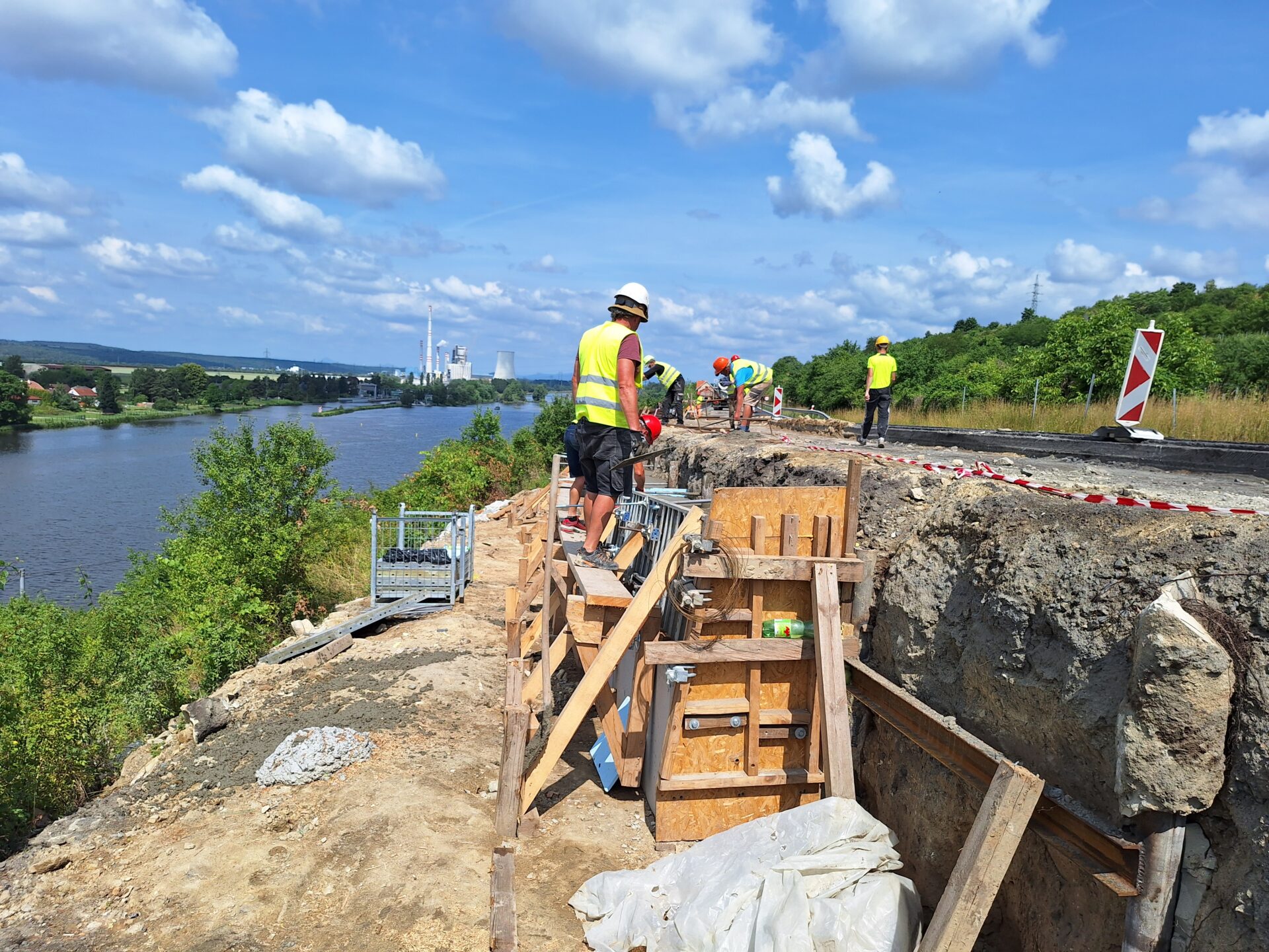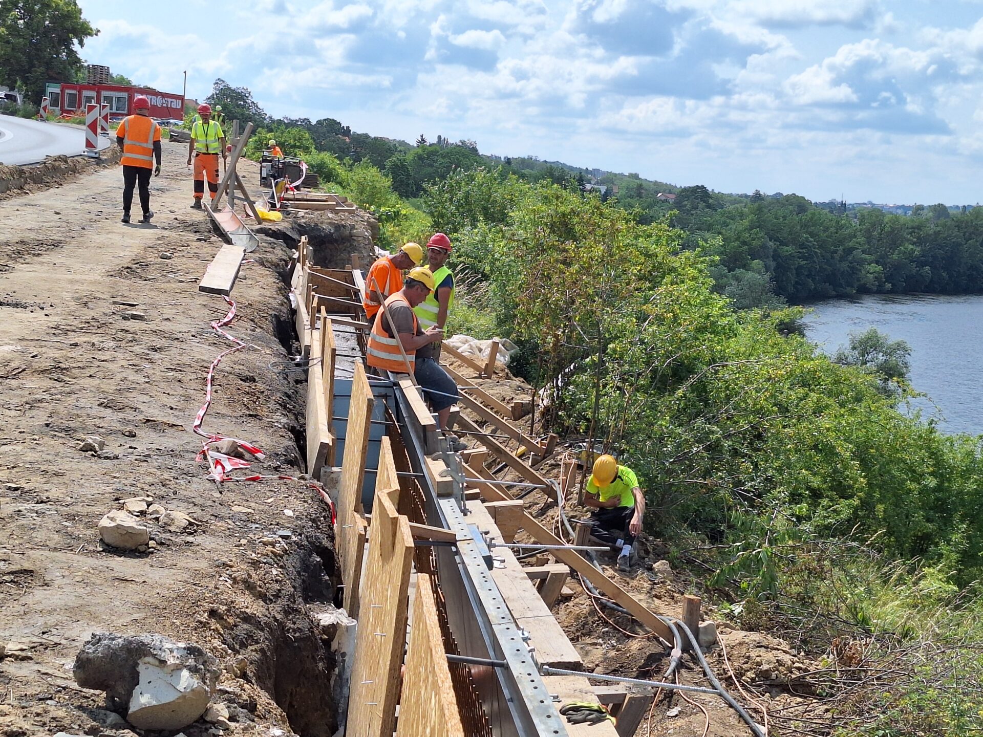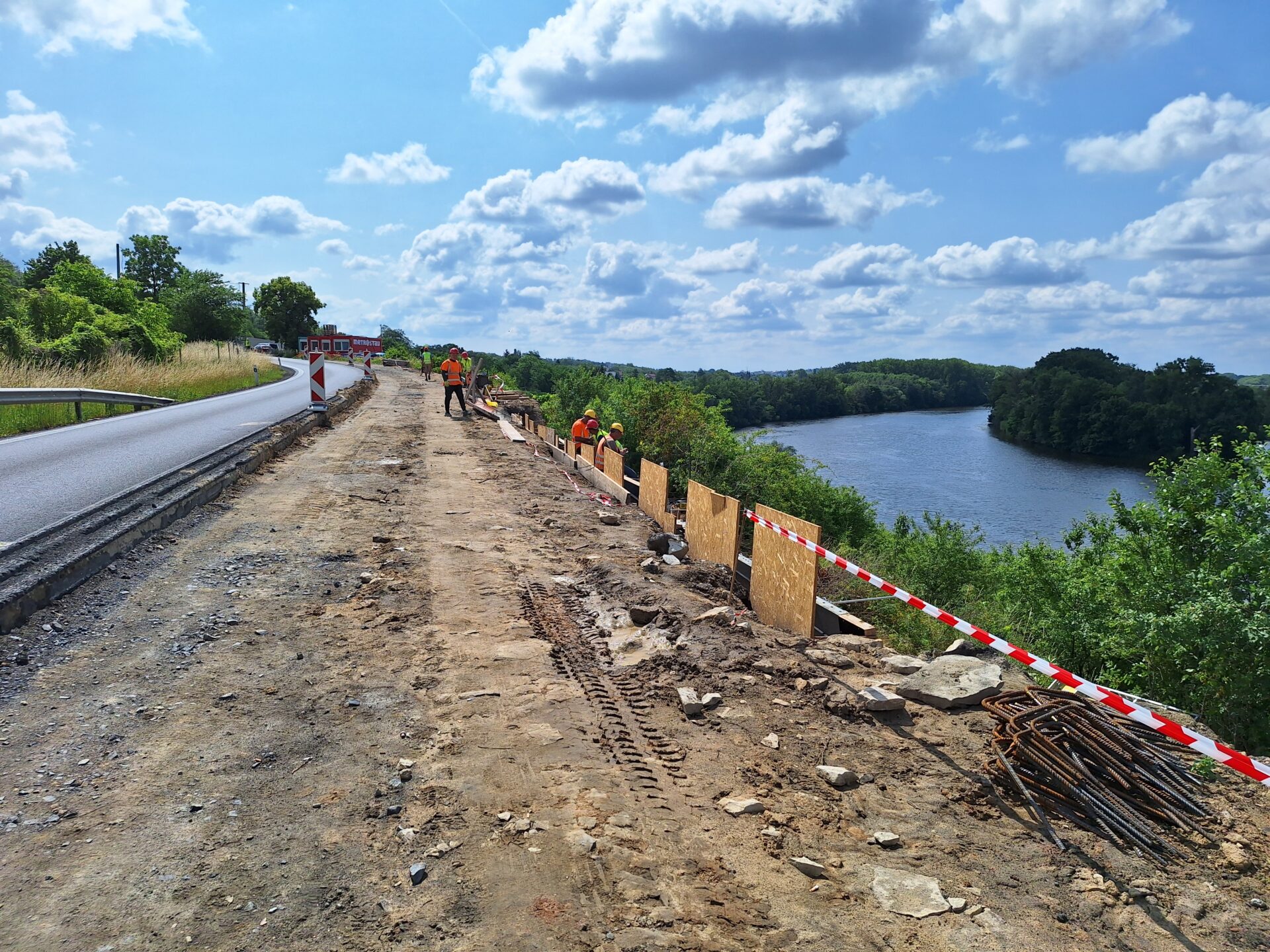 Původní opěrná zeď už byla odstraněna, na místě teď probíhá postupná výstavba nové. Odvrtány byly mikropiloty a práce, které znesnadňuje značně jílovité podloží se nyní soustřeďují na založení nové zdi, instalaci armatur a následně bude provedena betonáž. Současně bude rekonstruována přilehlá poloviny vozovky silnice I/9, která už byla odfrézována a nyní budeme sanovat podkladní vrstvy. Každý den tudy projede na 10 000 aut, z toho přibližně pětinu tvoří nákladní doprava. Na stavbě se denně podílí na 20 dělníků. Ti aktuálně pracují ve svahu, nad železniční tratí.