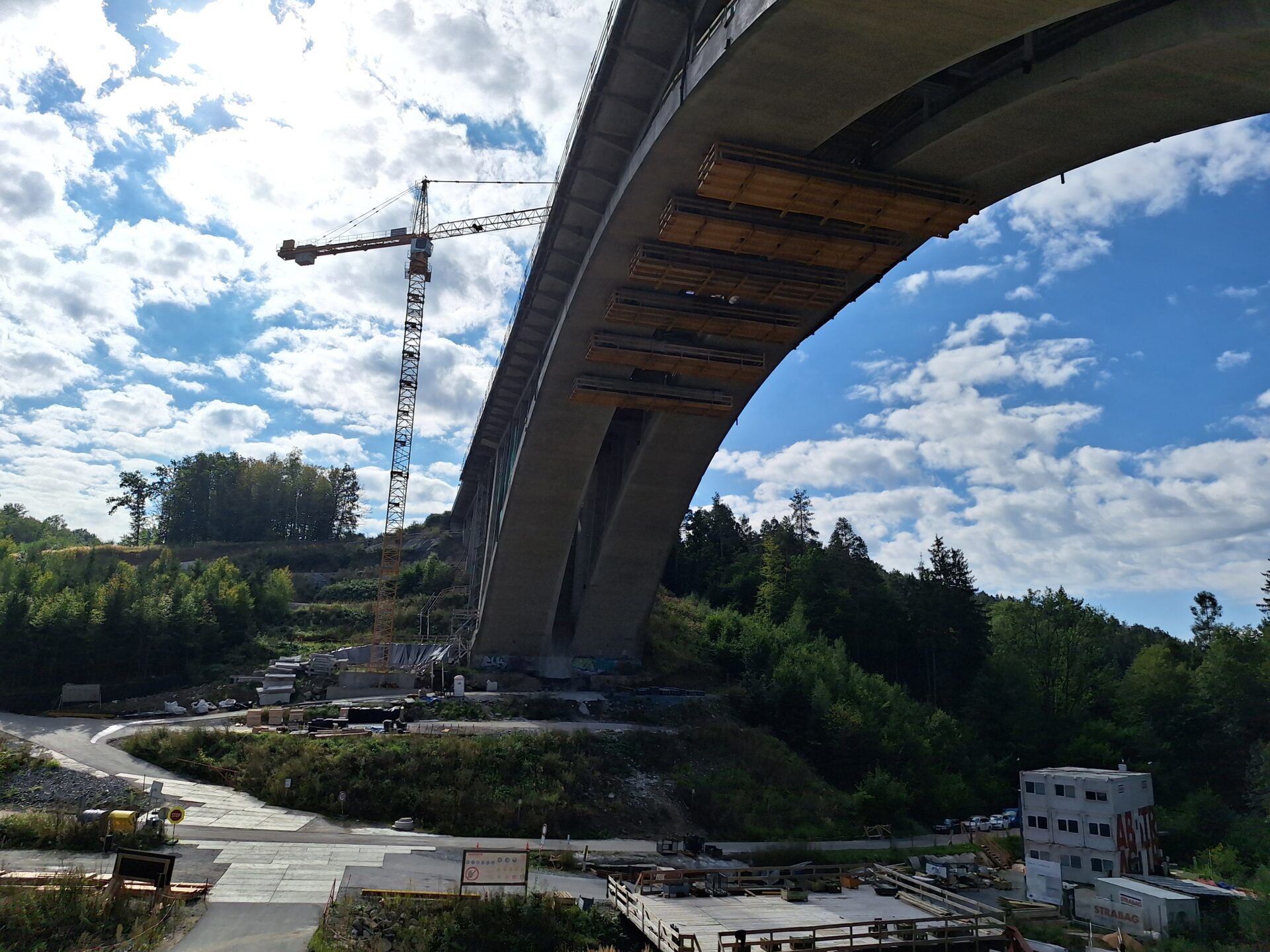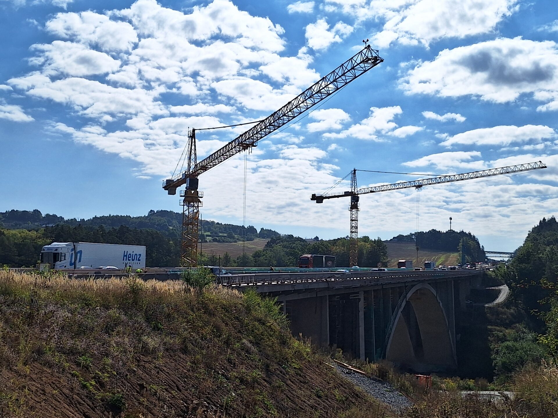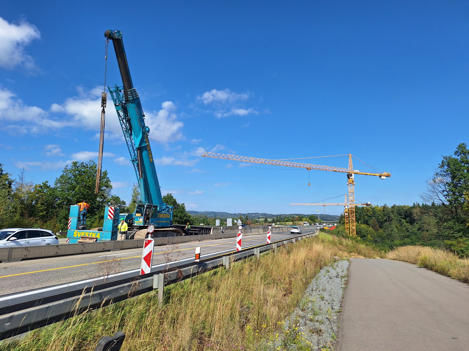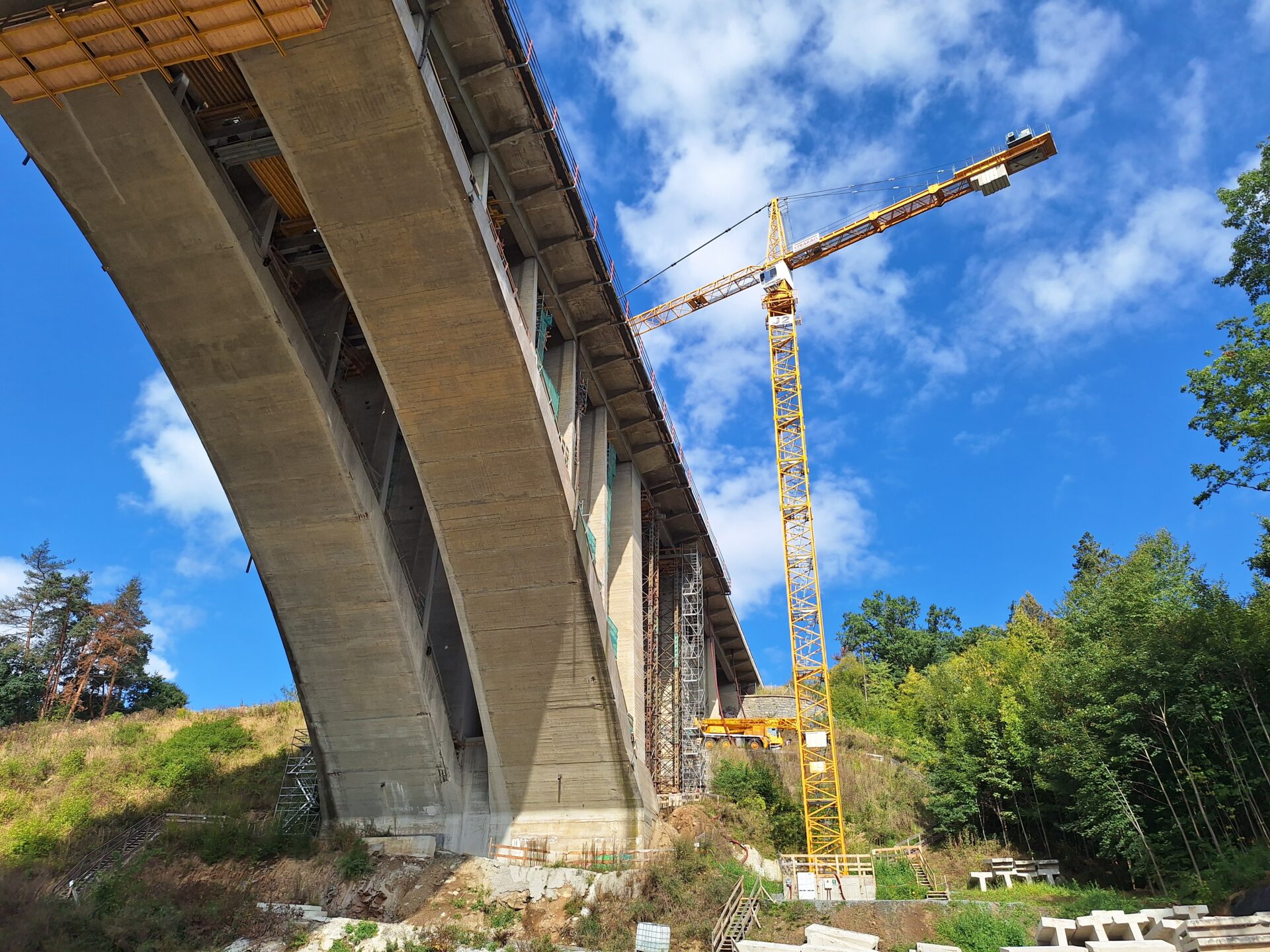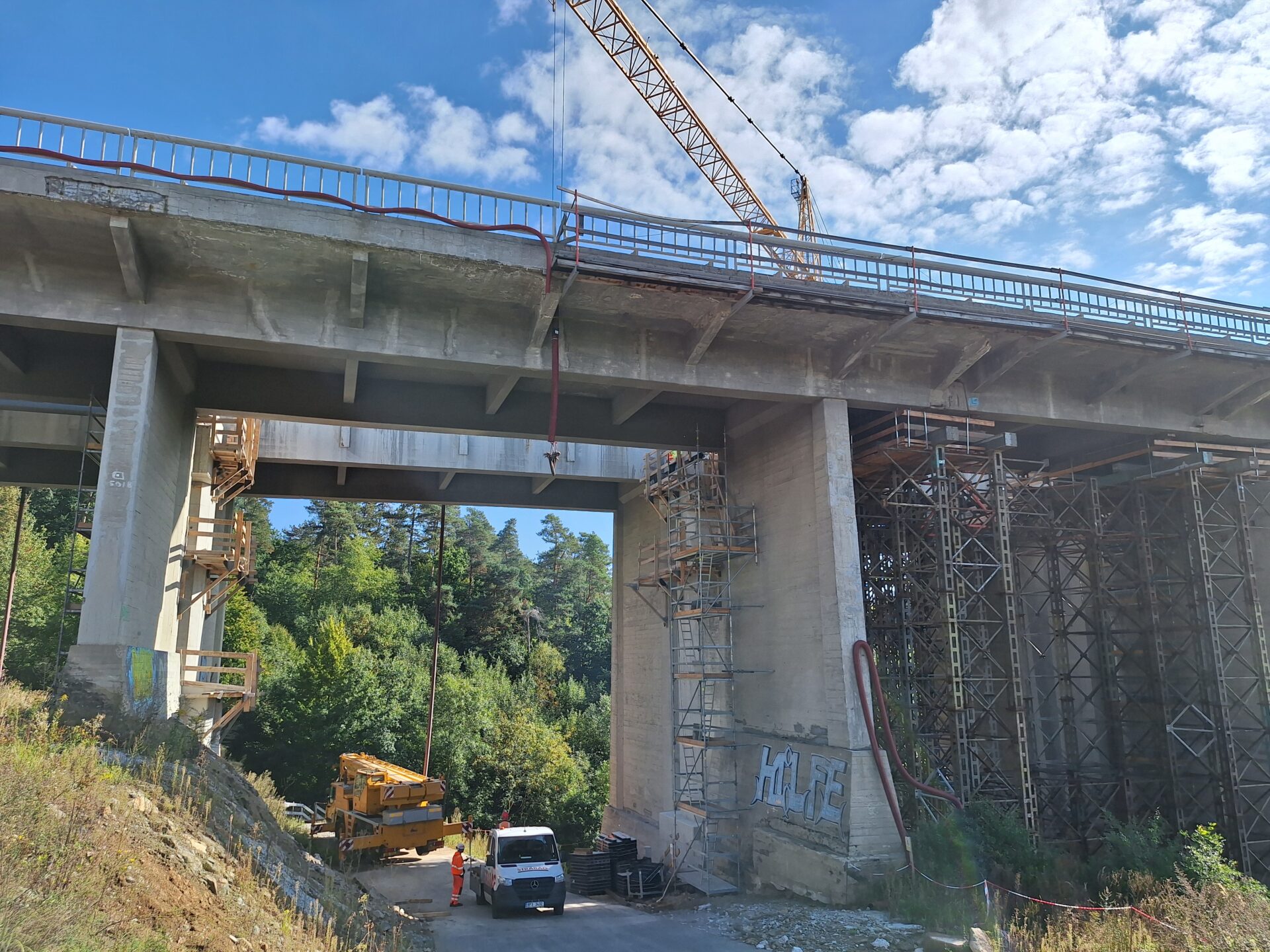 Rekonstrukce postupuje dle aktualizovaného harmonogramu, který nadále počítá s deklarovaným uvedením opraveného mostu do provozu v roce 2027. Menší úpravu harmonogramu si vyžádal výkyv ve výrobě a dodání některých nosníků. Demolice původních stojek byla v patřičném rozsahu dokončena, jejich zbytek bude odstraněn spolu se starou nosnou konstrukcí až po historický oblouk, který zůstane zachován a bude sanován. Jako první bude rozebírána polovina mostu směr Praha. Se zahájením této dílčí stavební operace je počítáno na přelomu listopadu a prosince, trvat bude přibližně rok. Dál probíhají práce ve středním dělícím pásu, a to nejen na mostě samotném, ale také před vjezdem na něj směr Praha. Kromě autojeřábů schopných unést až 500 t máme na stavbě také dva věžové jeřáby s výškou 60 m, které přenášejí součásti nezbytné k úpravě středního dělícího pásu z pod mostu na dálnici, abychom kvůli přepravě a vykládce těchto součástí nemuseli zcela zastavovat dálniční provoz.