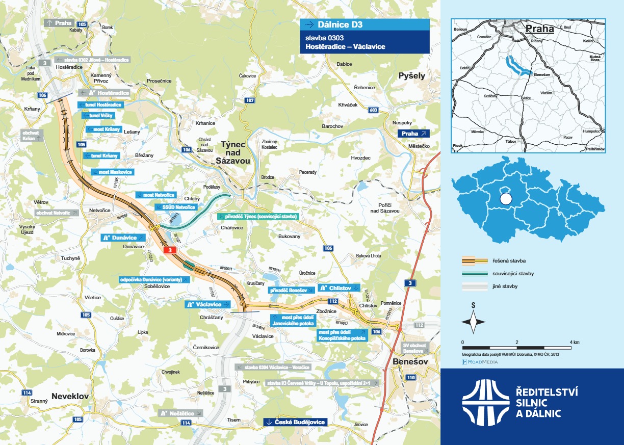 Příprava stavby úseku Hostěradice – Václavice středočeské části dálnice D3, jehož součástí bude i odpočívka Dunávice, pokračuje dál. Probíhá geodetické oddělování hranic pozemků pro tvorbu geometrických plánů a znaleckých posudků. Majetkoprávní příprava je zahájena, běží rozesílání návrhů kupních smluv. Vedle toho probíhá i příprava podkladů pro archeologický a pyrotechnický průzkum s cílem zahájit stavbu v roce 2028 a o čtyři roky později ji uvést do provozu. Předpokládané náklady činí 14,5 miliardy Kč bez DPH.