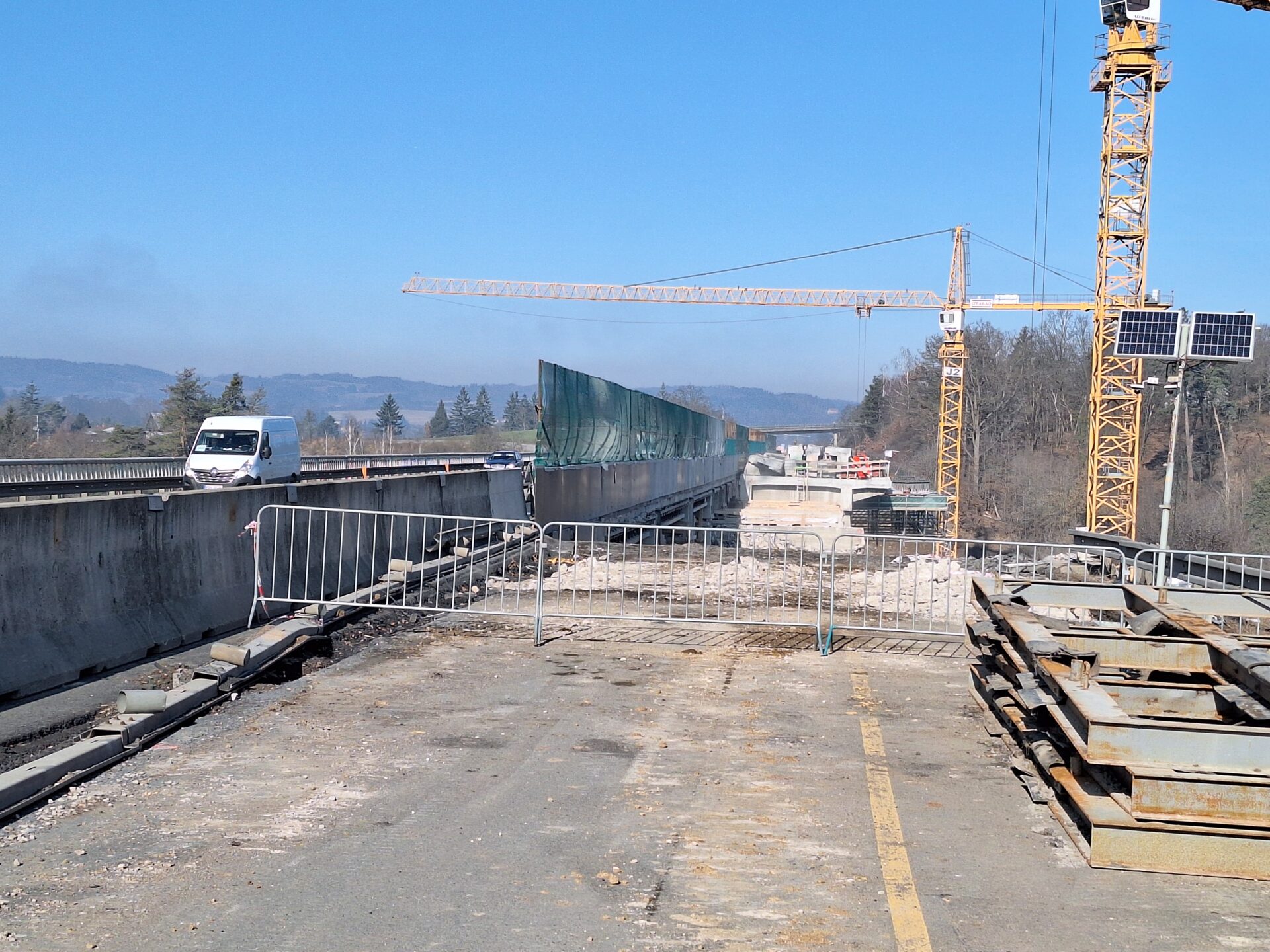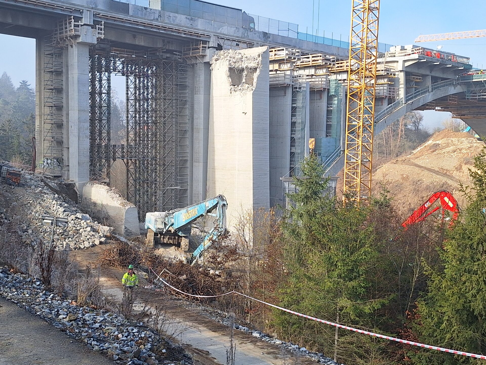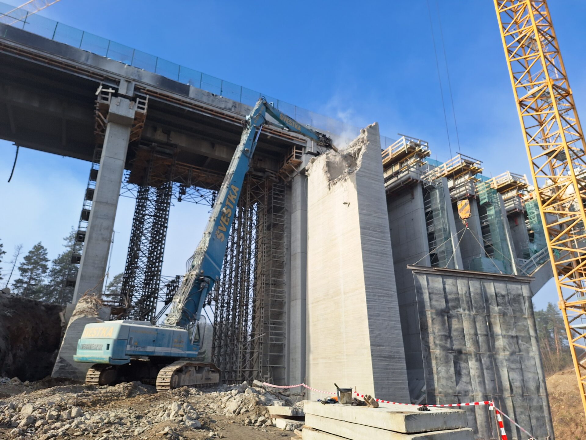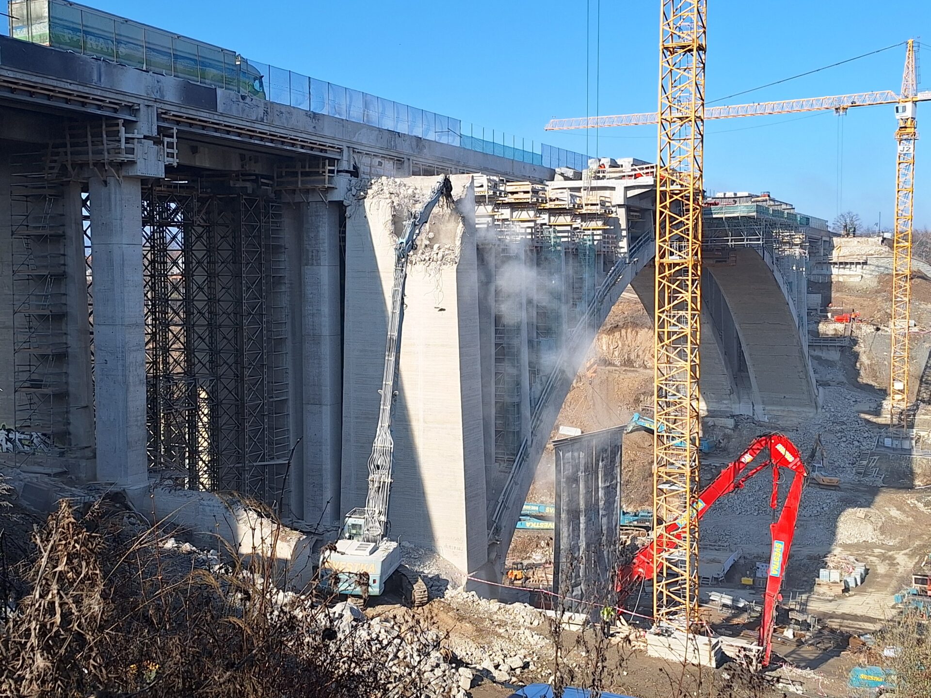 Původní nosná konstrukce už byla odstraněna, betonové bloky o váze až 50 tun odřezány a sneseny z výšky 40 metrů. Aktuálně je demolován poslední starý pilíř mostu. Betonová suť je od kovových částí separována, drcena na menší kusy a počítá se s jejím opětovným zapracováním do stavby. Odhadujeme, že z demolice starých částí mostu vznikne celkem na 10 000 tun recyklátu.