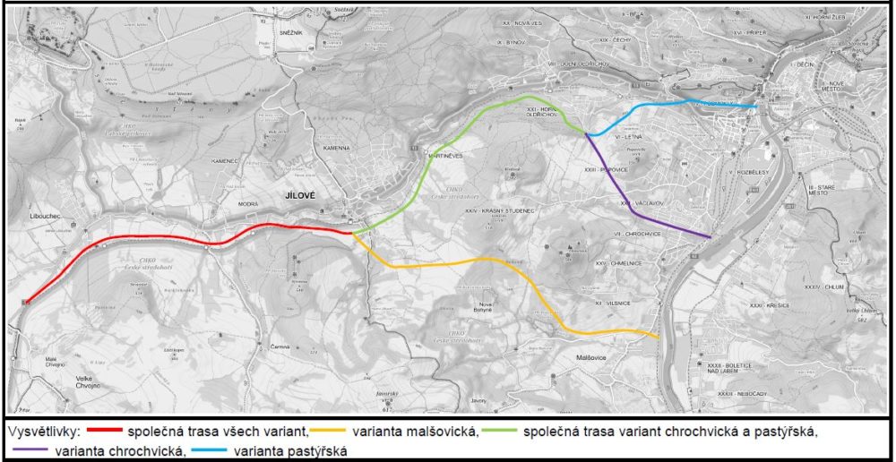 Předkládaná dokumentace EIA hodnotí tři varianty technického řešení, tj. variantu Chrochvickou, Pastýřskou a Malšovickou. Mezi posuzované trasy v této dokumentaci varianta podél Labe za využití silnice I/62 není zařazena z několika důvodů.