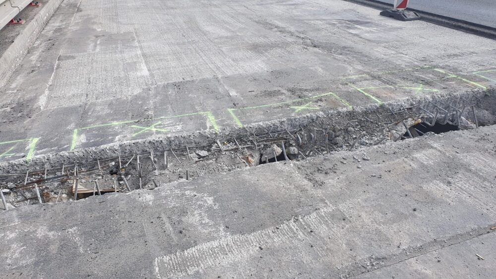 Mezi Teplicemi a Novými Dvory na silnici I/8 opravujeme přibližně 3,5 km dlouhý úsek. Aktuálně práce probíhají na mostech v Bystřanech, kde jsme odbourali mostní závěry, zjistili jsme špatný stav hydroizolace, kterou jsme odfrézovali a za pomoci sond jsme zjistili kaverny v nosnících, které musíme zasanovat. Dále jsme zjistili, že nové mostní závěry není jak zakotvit, proto nyní připravujeme nejoptimálnější technické řešení pro zhotovení nového uchycení.