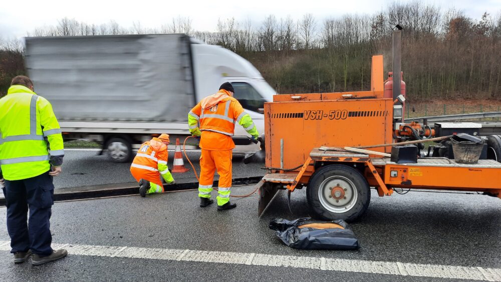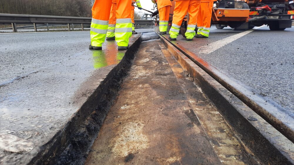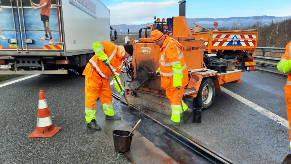 Středisko správy a údržby dálnice (SSÚD) v Řehlovicích opravuje výtluky ve spolupráci s SSÚD Domašov (správa na dálnici D1 u Brna), které přijelo vypomoci s pojízdným kotlíkem na ruční pokládku litého asfaltu, do kterého je přidána ještě plastická směs pro zvýšení přilnavosti a pevnosti. Tento způsob opravy výtluků je o dost kvalitnější s několikanásobně vyšší trvanlivostí než oprava výtluků studenou balenou asfaltovou směsí.