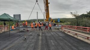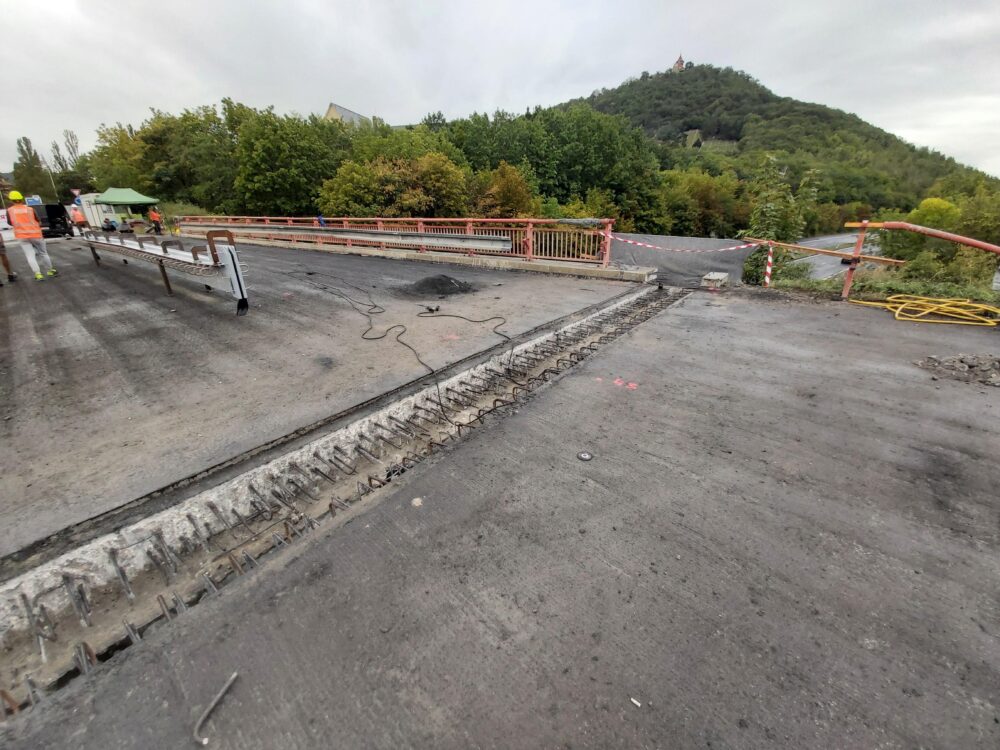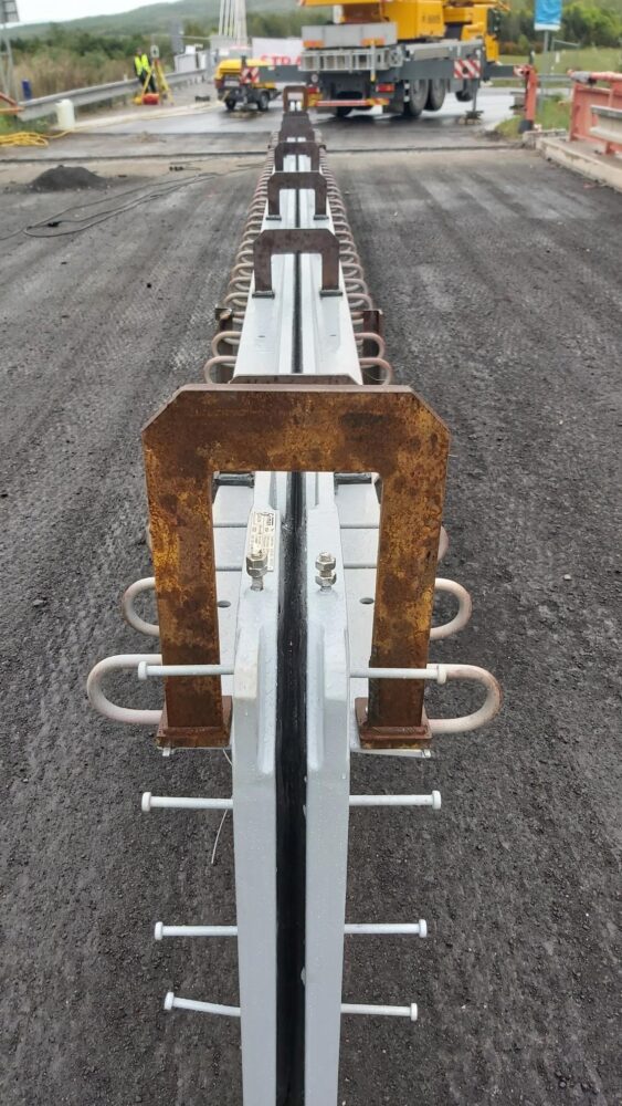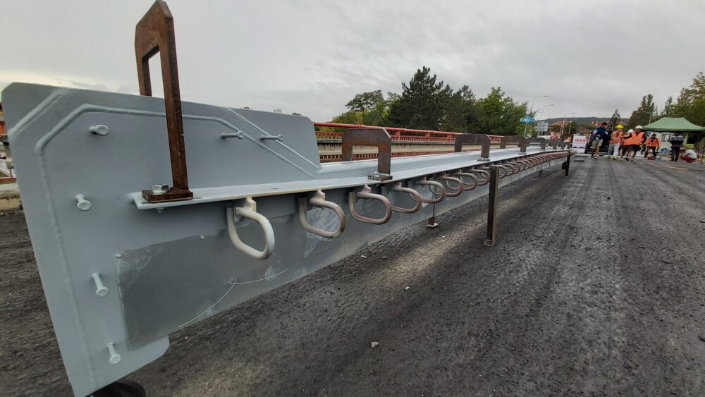 V Mostě u muzea na mostě přes silnici I/13 aktuálně za pomoci jeřábu osazujeme dva mostní závěry o celkové hmotnosti přesahující dvě tuny.