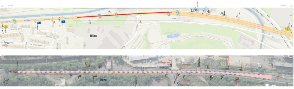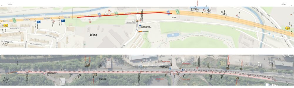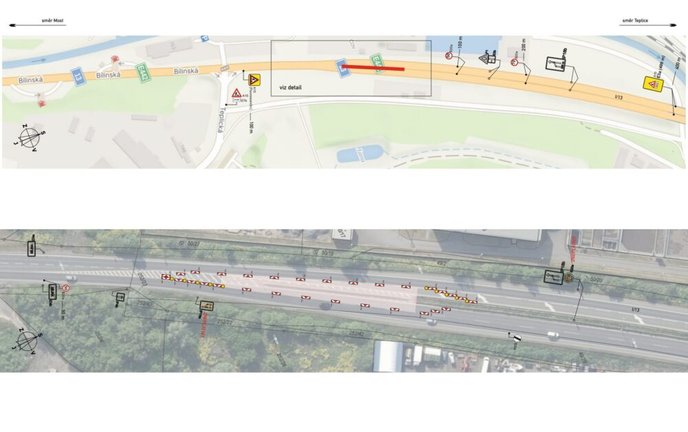 Na silnici I/13 dojde v rámci opravy k částečné uzavírce. Auta budou projíždět jedním jízdním pruhem v každém směru (v režimu 1+1). Mimo to bude uzavřen sjezd ze silnice I/13 do ulice Teplická.