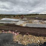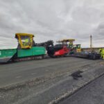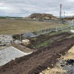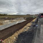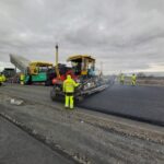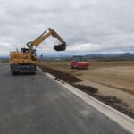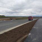 Na stavbě dálnice D7 u Chlumčan aktuálně pokládáme asfaltové vrstvy, montujeme svodidla, provádíme ohumusování, realizujeme kanalizaci a instalujeme oplocení.