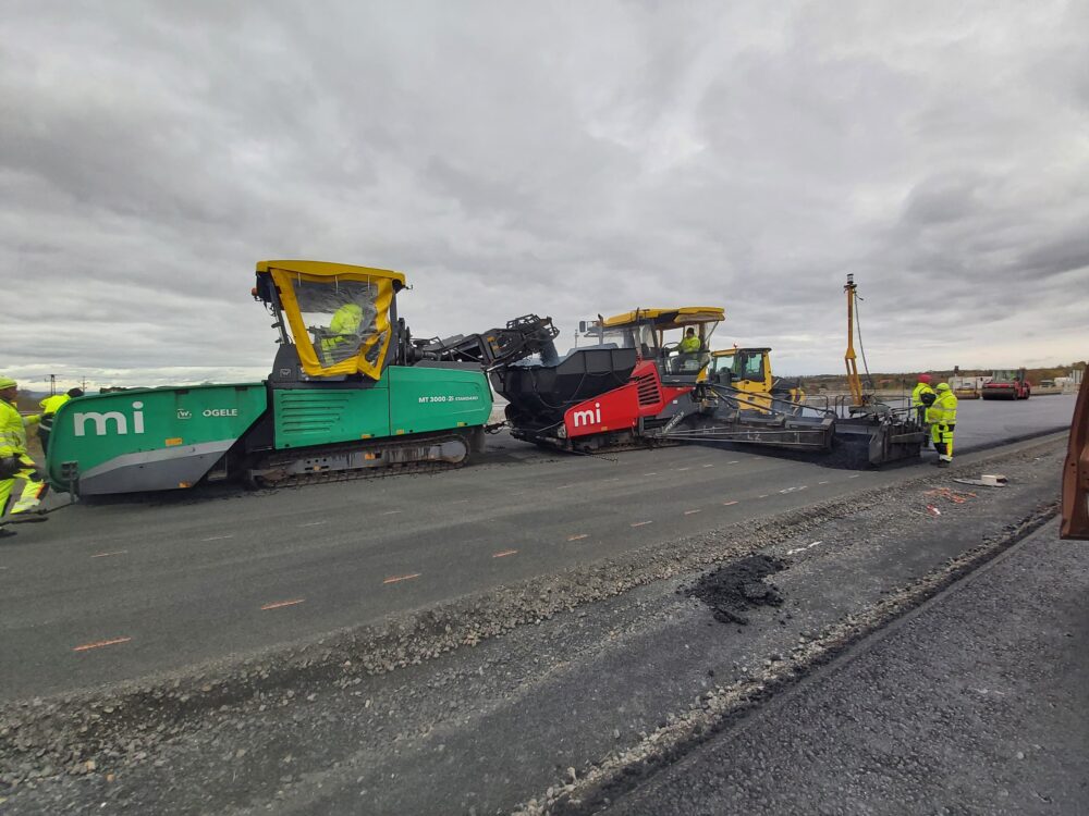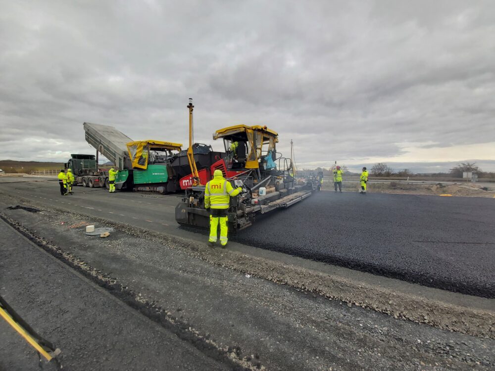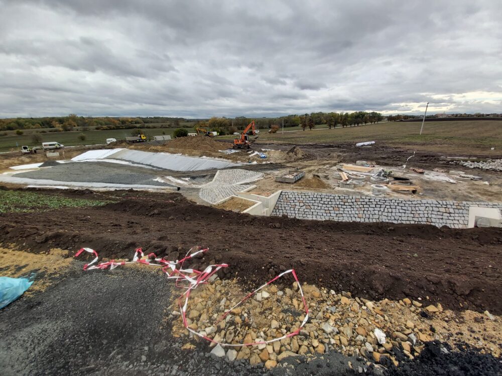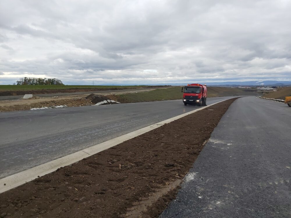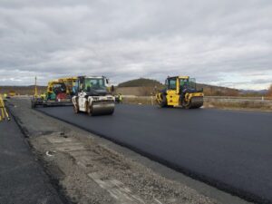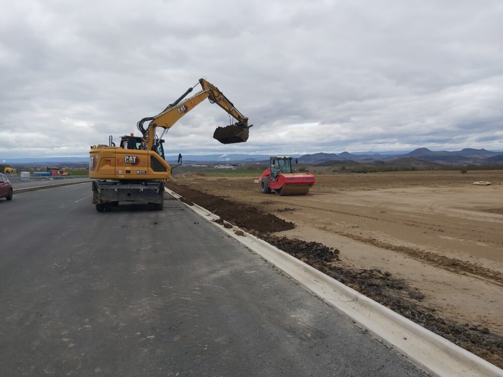 Na stavbě dálnice D7 u Chlumčan aktuálně pokládáme asfaltové vrstvy, montujeme svodidla, provádíme ohumusování, realizujeme kanalizaci a instalujeme oplocení.