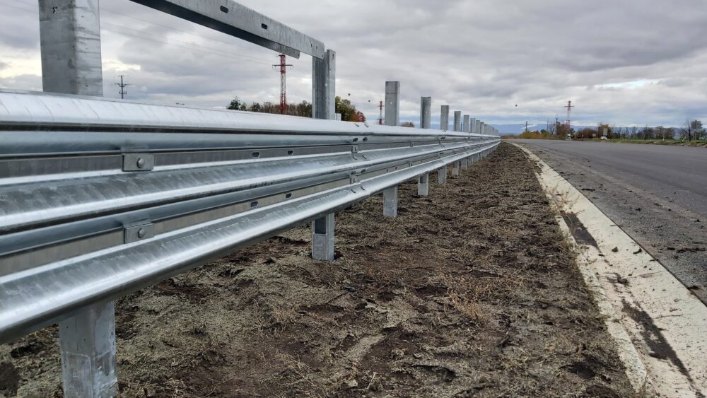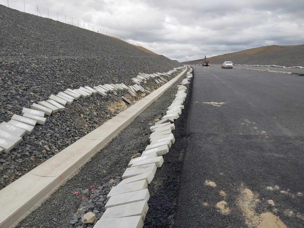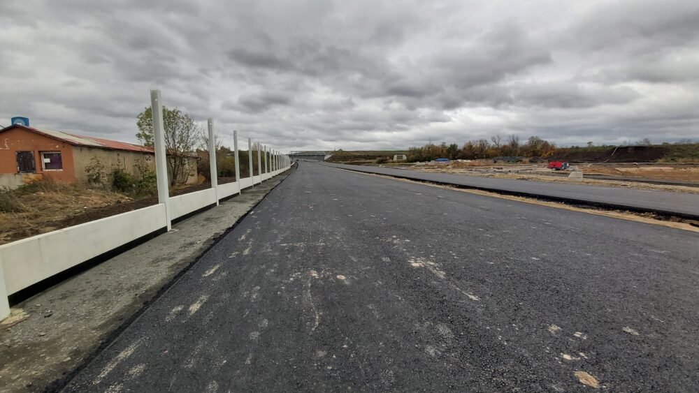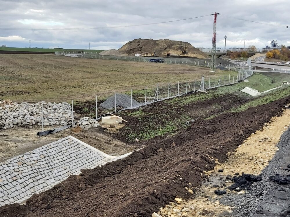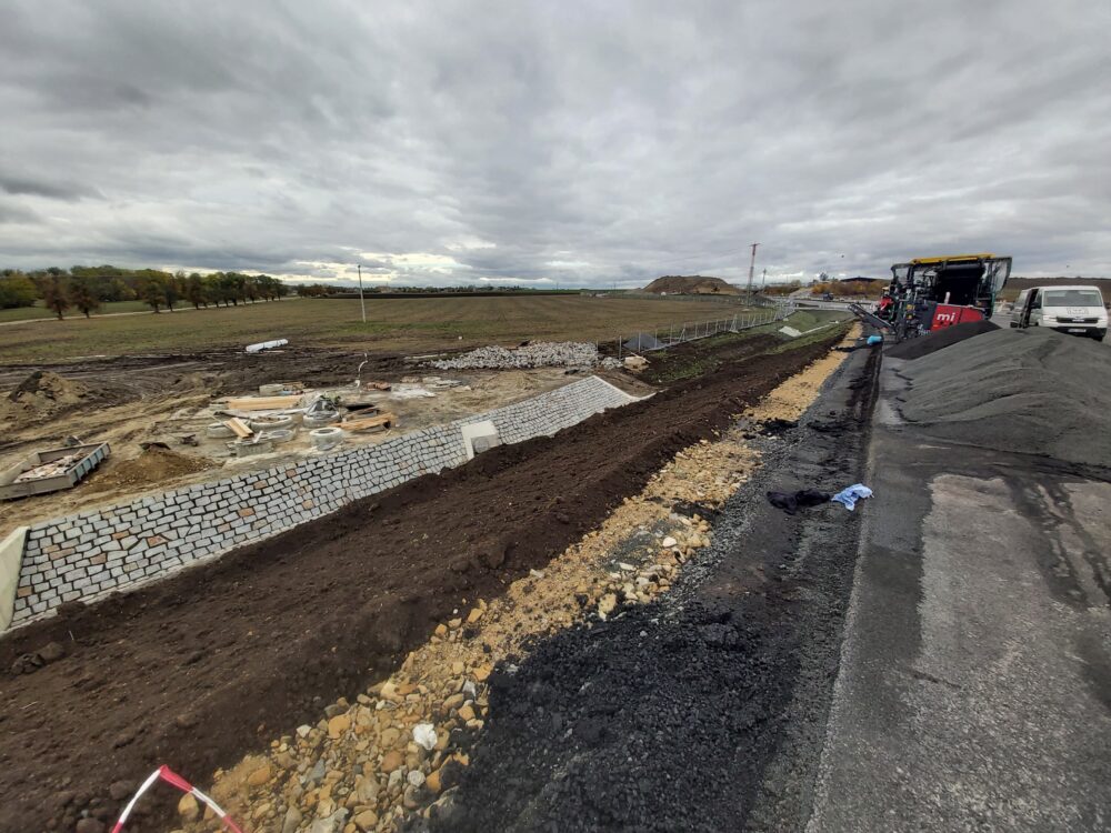 Stavíme také 3 metry vysokou protihlukovou stěnu o celkové délce 563 metrů. Nyní na protihlukové stěně osazujeme spodní železobetonové panely, na něž po pokládce finální asflatové vrstvy začneme instalovat hliníkové panely. Panelů bude celkem 236.