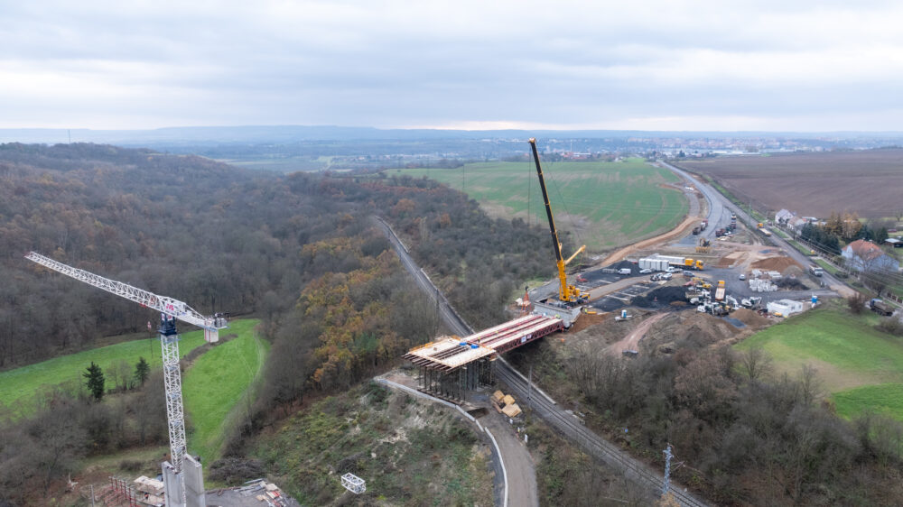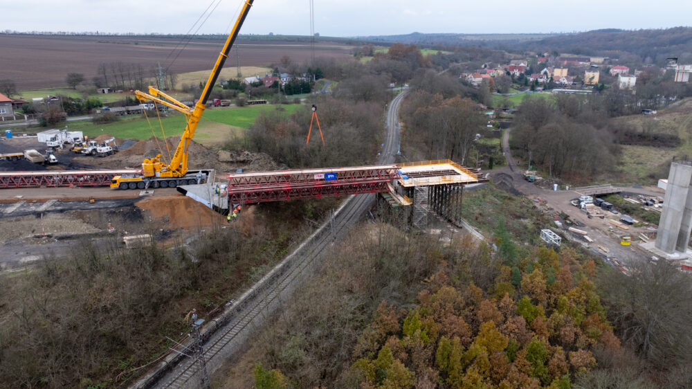 Nosníky nové mostní estakády v Žiželicích byly osazeny v neděli 17. listopadu. Montáž probíhala nad železniční tratí, z tohoto důvodu došlo k výluce na železniční trati Žatec – Chomutov.