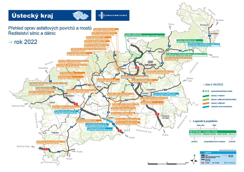 Podívejte se na mapu plánovaných oprav v Ústeckém kraji pro rok 2022. Aktuálně jsou v realizace 3 akce a další plánujeme zahájit během léta. Intenzivně pokračuje stavba dvou na sebe navazujících úseků dálnice D7 u Loun a Chlumčan. Letos budeme zahajovat výstavbu okružní křižovatky v Lovosicích a obchvatu s přemostěním v Žiželicích. O konkrétních termínech vás budeme včas informovat na Twitteru.