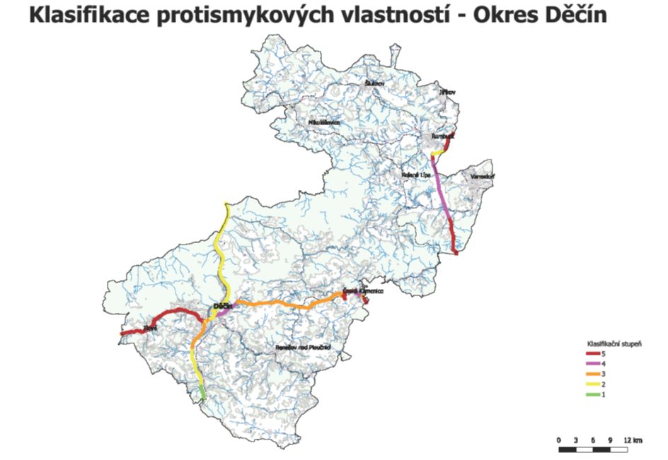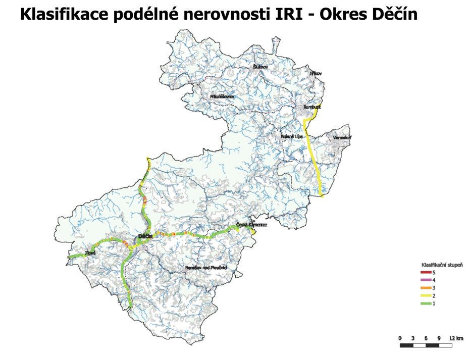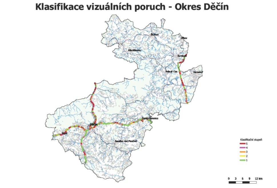 Jak probíhá výběr silnic I. třídy, které je třeba opravit a proč se frézují úseky, jež se mohou zdát na první pohled „zdravé“ a bez výtluků, detailně vysvětlili specialisté z nezávislých laboratoří provádějící diagnostiku vozovek a zkoušky kvality materiálů pozemních komunikací. Vše začíná vizuální prohlídkou vozovek pomocí panoramatické kamery, která zaznamenává veškeré poruchy. Následně je k sledovaným pozemním komunikacím přiřazen klasifikační stupeň ve škále 1 – 5 dle přílohy 2 TP 87 Navrhování údržby a oprav netuhých vozovek (schválen Ministerstvem dopravy ČR 1.3.2010) resp. TP 82 Katalog poruch netuhých vozovek (schválen Ministerstvem dopravy ČR dne 25.2.2010). Na mapě níže lze vidět klasifikaci vizuálních poruch v okrese Děčín: