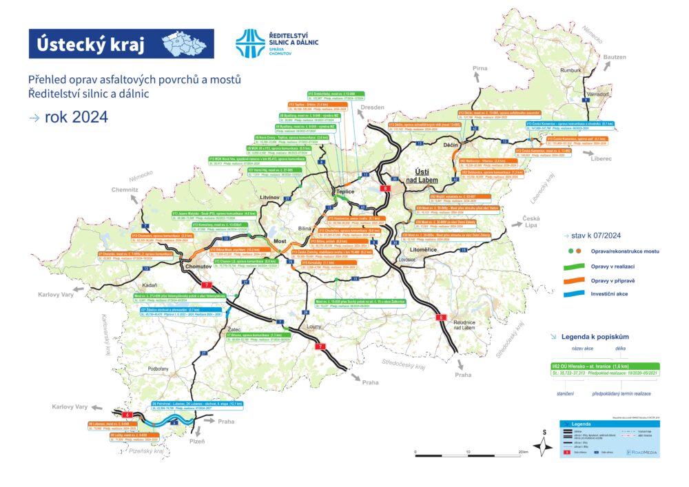 Opět po měsíci přinášíme aktualizovanou mapu oprav a staveb. V tomto měsíci zahájíme opravy čtyř mostů, a to na silnici I/27 u obce Háj u Duchcova, I/13 v obci Soběchleby, I/15 u obce Želkovice a I/27J v obci Velemyšleves. A na silnici I/7 u Března vyměníme asfaltové souvrství na více jak 1 kilometru.