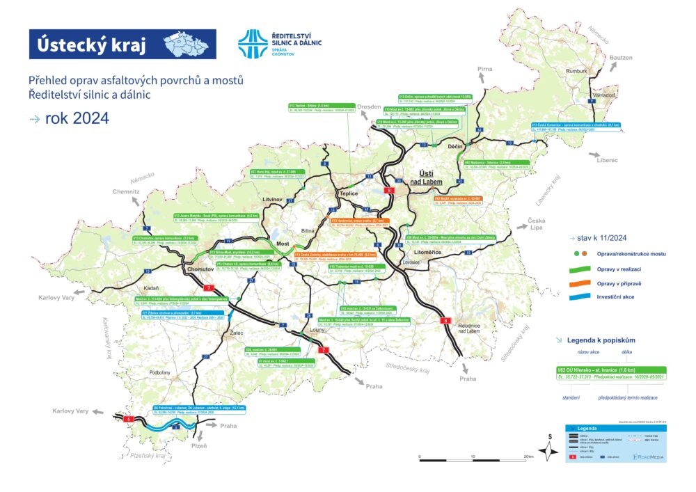 Přehled významných oprav Ústeckého kraje za měsíc listopad. Většinu akcí bychom chtěli dokončit v tomto roce. Složitější opravy pak budou pokračovat i v tom následujícím. V listopadu dokončujeme např. opravy mostů v Jílovém na silnici I/13, v Horním Háji nebo v obci Velemyšleves na silnici I/27. A od minulého týdne projedete bez omezení na průtahu Chomutovem na silnici I/13.
