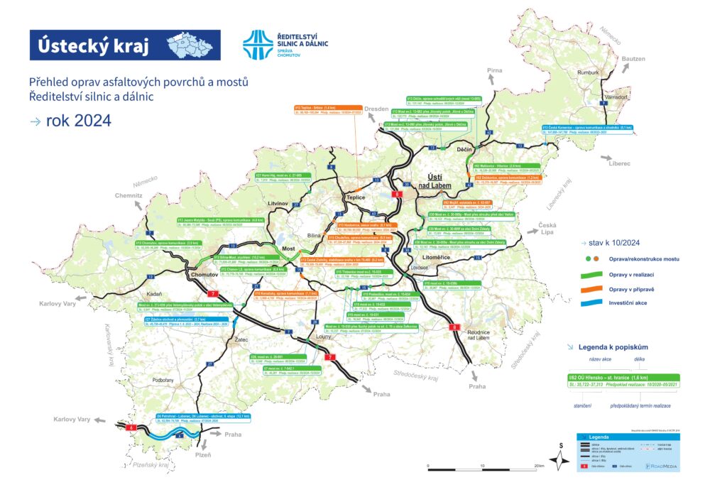 Přinášíme aktuální přehled významných oprav Ústeckého kraje. V tomto měsíci jsme rozběhli opravy např. na silnici I/13 v Jílovém, I/62 mezi Malšovicemi a Vilsnicí či na silnici I/15 u Třebenic a na I/13 v Chomutově.