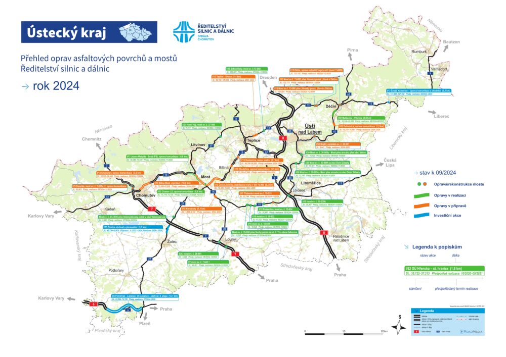 Po měsíci přinášíme aktuální přehled významných oprav v Ústeckém kraji. V září bychom chtěli zahájit opravy několika mostů v okresech Ústí n. L., Litoměřice a Louny. Intenzivně pracujeme na zlepšení silnice I/13 mezi Děčínem a Teplicemi. Mimo jiné plánujeme koncem měsíce začít s opravou více jak 2,5 km dlouhého úseku na silnici I/62 Malšovice – Vilsnice.