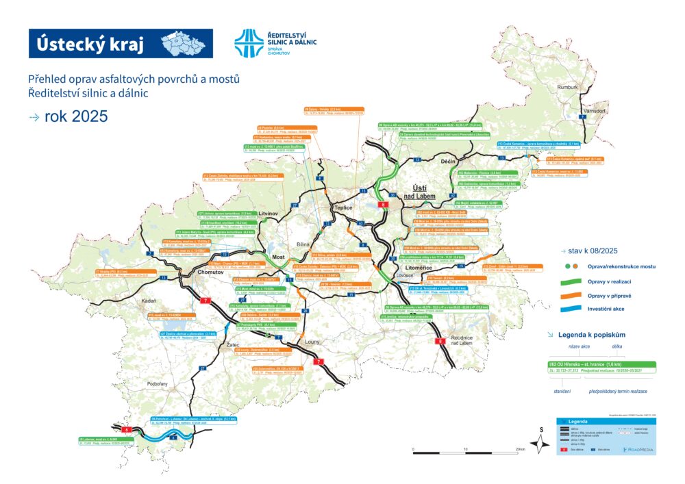 Aktualizovaná mapa významných oprav v Ústeckém kraji za měsíc srpen.