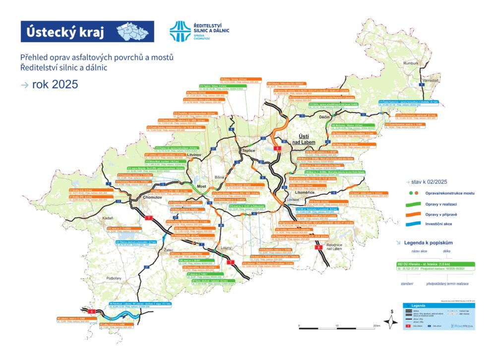 Přinášíme přehled významných oprav pro tento rok. Letos nás čekají opravy na dálnici D8 a řada také na silnici I/13. Jednou ze zásadních akcí v Ústeckém kraji bude mimo jiné rekonstrukce mostu Mojžíř na silnici I/62. Zhotovitelem se stala společnost STRABAG SIS a. s. za vysoutěženou cenu 258,989 mil. Kč bez DPH.