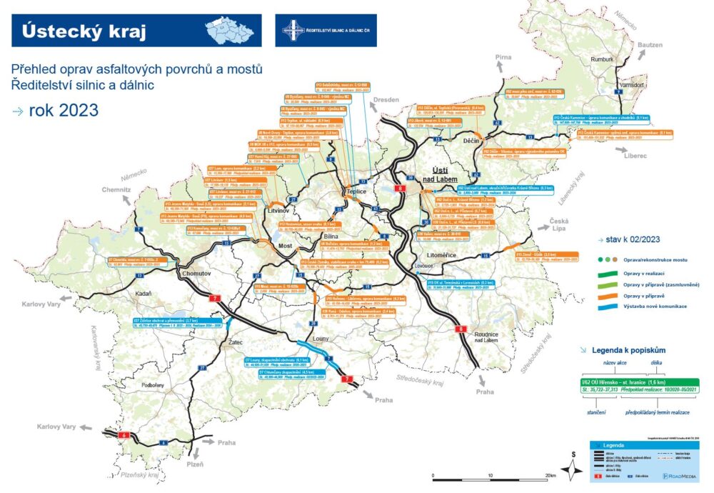 Podívejte se na přehled významných oprav, které plánujeme tento rok v Ústeckém kraji realizovat. Pustíme se nejen do velkoplošných oprav asfaltového souvrství, ale i do rekonstrukcí mostů. Na mapě také vidíte výstavbu nových komunikací, které jsou v realizaci, jako například dalniční úseky D7, ale i ty které plánujeme zahájit.