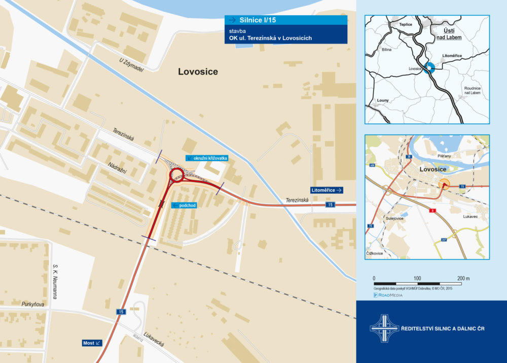 Máme vydané pravomocné stavební povolení na stavbu „Okružní křižovatka I/15 x ul. Terezínská v Lovosicích“. Součástí akce bude i výstavba protihlukové stěny či podchodu pod komunikací I/15. Stavba zvýší bezpečnost a plynulost provozu ve městě Lovosice. Pokud půjde vše hladce, předpokládáme zahájení stavby ještě v letošním roce. Podmínkou je stavbu zrealizovat během jedné stavební sezóny.