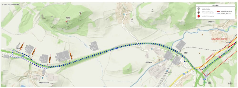 uzavřena bude zpevněná krajnice a část pravého jízdního pruhu v km 65,570–64,756 vlevo včetně levé části výjezdové větve MÚK Řehlovice (EXIT 65) vlevo o délce 50 m