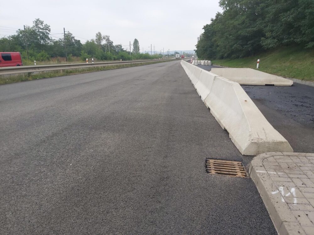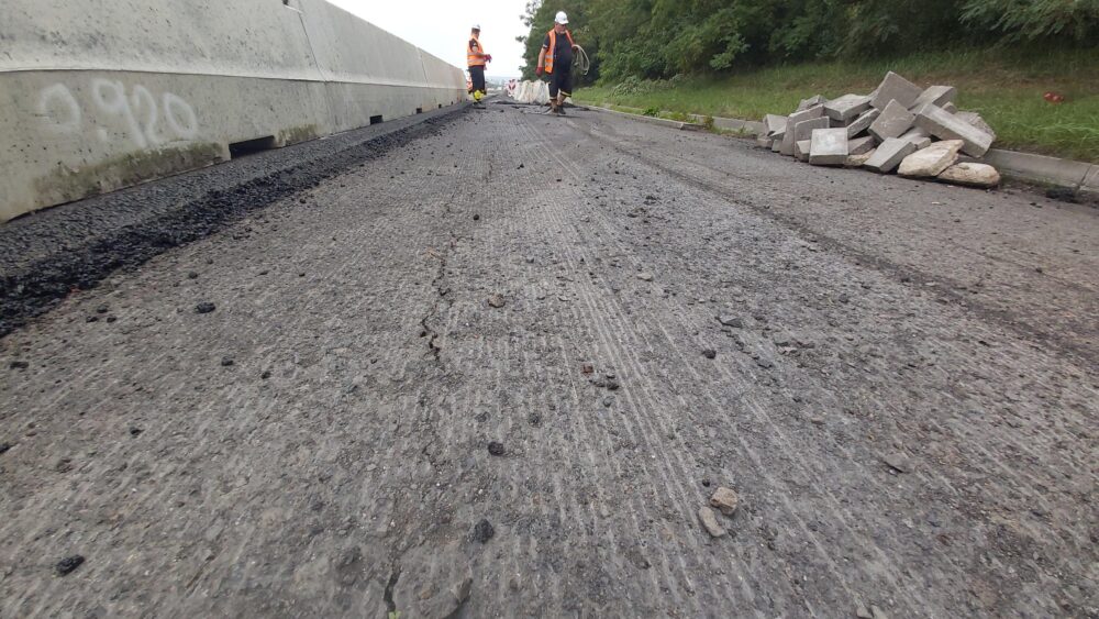 V jízdním pásu ve směru na Teplice u jezera Matylda jsme dnes pustili do provozu levý jízdní pruh a v pravém jízdním pruhu řešíme způsob sanace trhliny betonové desky, která se nachází pod asfaltovými vrstvami. Její sanaci aktuálně připravujeme a následně ji provedeme injektážními vrty, kterými vyplníme trhlinu pod vozovkou a poté budeme moci položit asfalt.