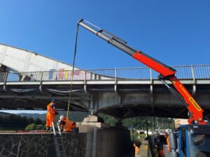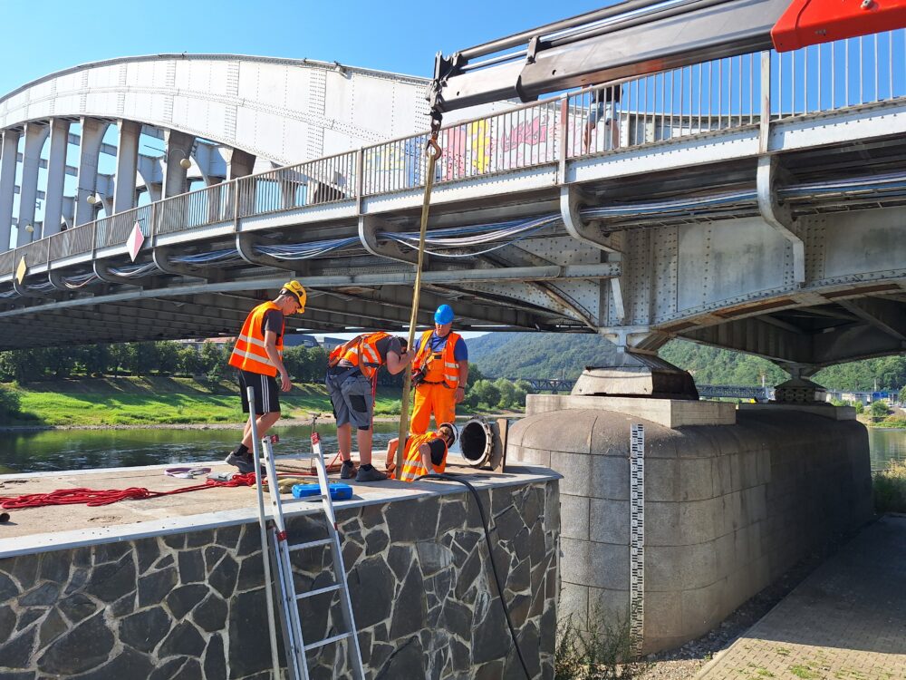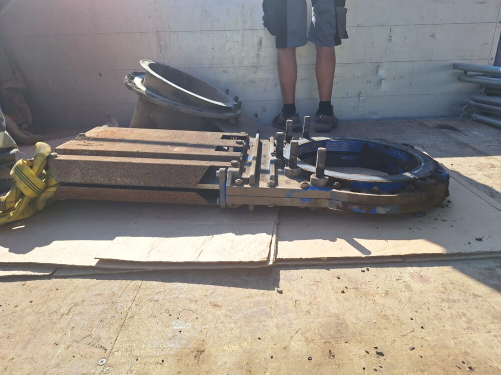 V prvních dvou dnech jsme pročistili potrubí do čerpací stanice na levé i pravé straně. A dnes 14. 8. jsme demontovali a vyjmuli klapku neboli deskový uzávěr. Zpětnou montáž uzávěru provedeme po jeho opravě, respektive po dodání nového uzávěru v případě, že oprava stávajícího nebude reálná, a to do 2 měsíců od vyjmutí.