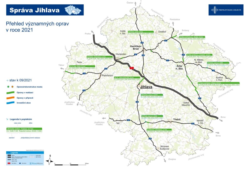 V září jsme žádnou z nových akcí nezačali a v této stavební sezóně již zřejmě zahájíme pouze výstavbu nové PHS na sil. I/38 v Radostíně. Silnice I/34 mezi Ždírcem n./Doubravou a Benátkami je již uvedena do provozu a dokončí se v tomto roce. Opravovanou silnici I/19 Kámen-hr. kraje máme v plánu uvést do provozu v polovině října tohoto roku, ale na příklad na opravě silnice I/37 ve Žďáru n. Sázavou a I/37 Ostrov n. Oslavou-Křižanov budeme pracovat na úsecích, které zvládneme dokončit do začátku zimní údržby a v dalších opravám budeme pokračovat až ve 2. čtvrtletí příštího roku.