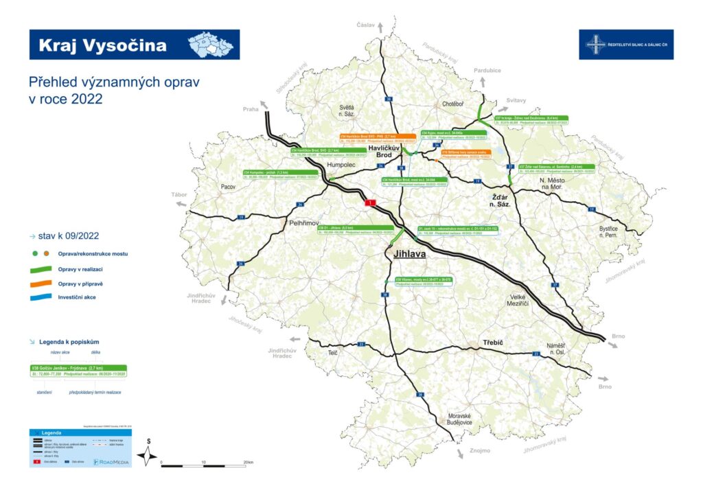 K 26.9.2022 probíhá v našem kraji 9 oprav na silnicích I. tříd. V sobotu 24.9.2022 jsme uvedli do provozu most ev. č. 34-045a na sil. I/34 a v následujících týdnech budeme uvádět do provozu další stavby. V první polovině října se to bude týkat oprav na silnici I/34 Humpolec průtah a mostu ev.č. 34-044 u Havlíčkova Brodu. K 15.10.2022 počítáme s tím, že do provozu uvedeme pravý jízdní pás silnice I/38 mezi dálnicí D1 a Jihlavou. Levý jízdní pás opravíme v následující stavební sezóně.