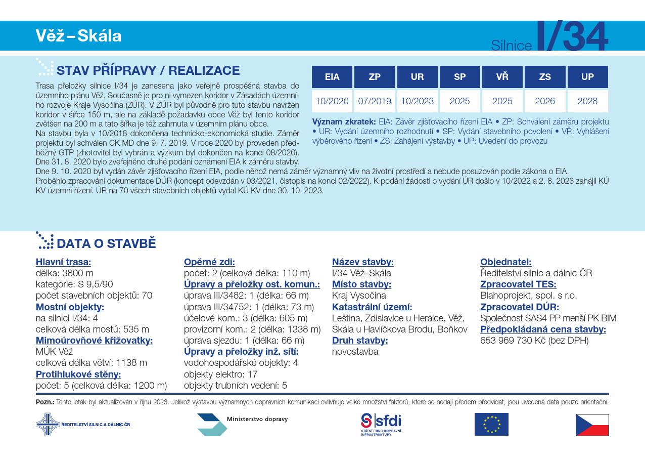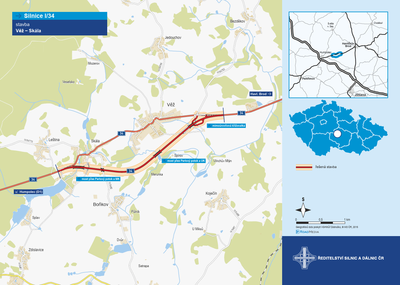 Krajský úřad Kraje Vysočina vydal územní rozhodnutí na stavbu přeložky silnice I/34 mezi obcí Věž a její místní částí Skála. 3800 metrů nové komunikace se čtyřmi mosty a jednou mimoúrovňovou křižovatkou má zajistit větší bezpečnost silničního provozu a místní obyvatele ušetřit negativních vlivů dopravy.