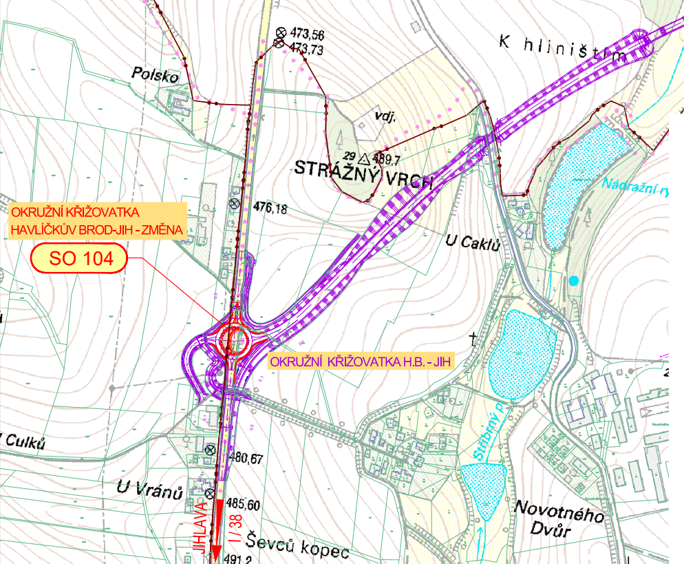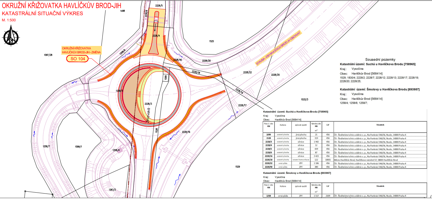 Plánovaná stavební úprava řeší doplnění zpevnění v rámci najetí a vyjetí z křižovatky. Jedná se o částečné zpevnění plochy se sklonem 6 % od středu okružní křižovatky. Součástí bude výšková úprava středového ostrůvku ve směru do Havlíčkova Brodu. Ostrůvek je navržen přejízdný. Rozšíření středového ostrůvku vychází z prověření projetí nadrozměrného vozidla. V místě hrany u prstence bude osazen nový přejízdný obrubník v souladu s ostrůvky na větvích křižovatky. Dále bude doplněna dlažba v místě rozjezdů na vjezdu a výjezdu do okružní křižovatky. Jedná se o zpevnění dlažbou v prostoru nezpevněné krajnice.