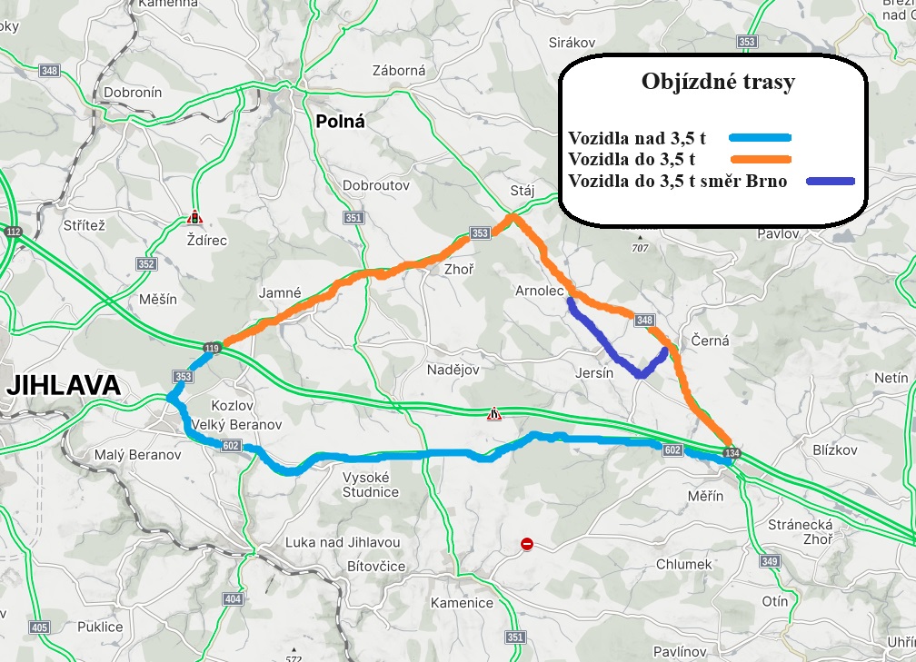 Objízdná trasa pro vozidla nad 3,5 t povede obousměrně mezi EXIT 119 Velký Beranov a EXIT 134 Měřín po silnici II/602 přes Řehořov s tím, že na dvou mostech na této trase, kvůli jejich nižší zatížitelnosti, bude kyvadlový provoz, řízený regulovčíky. Pro vozidla do 3,5 t bude objížďka mezi EXIT 119 Velký Beranov a EXIT 134 Měřín vedena rovněž obousměrně po silnicích II/353 a II/348 přes Zhoř, Stáj, Arnolec a Černou s tím, že v obci Arnolec se kvůli prudké a úzké zatáčce doprava rozdělí a směr Brno bude vedena k obci Jersín a odtud do Černé.