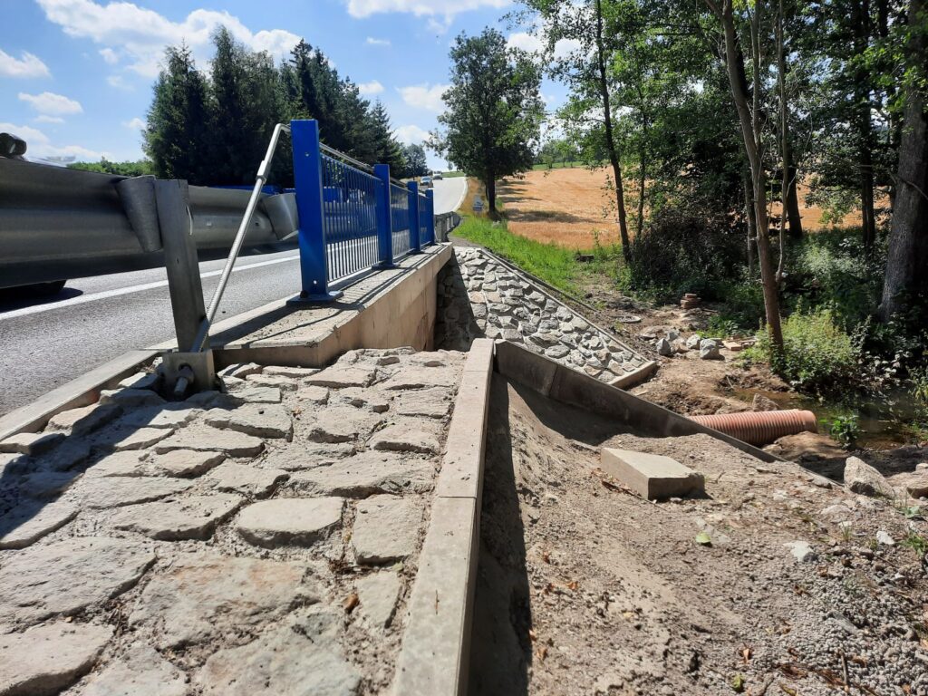 Dokončujeme opravu mostu ev.č. 19-076 u Radňovic na silnici I/19 mezi Novým Městem na Moravě a Žďárem nad Sázavou. Minulý týden jsme na mostě položili nové vozovkové souvrství, provedli zálivku spár, obnovili vodorovné dopravní značení, zpevnili krajnici a instalovali nová svodidla. V oblasti svahového kužele podél křídel mostu jsme osadili silniční obruby a zahájili dláždění svahu kamenem do betonu. Souběžně se dláždí odvodňovací skluzy zakončené vývařištěm a koryto toku pod mostem.