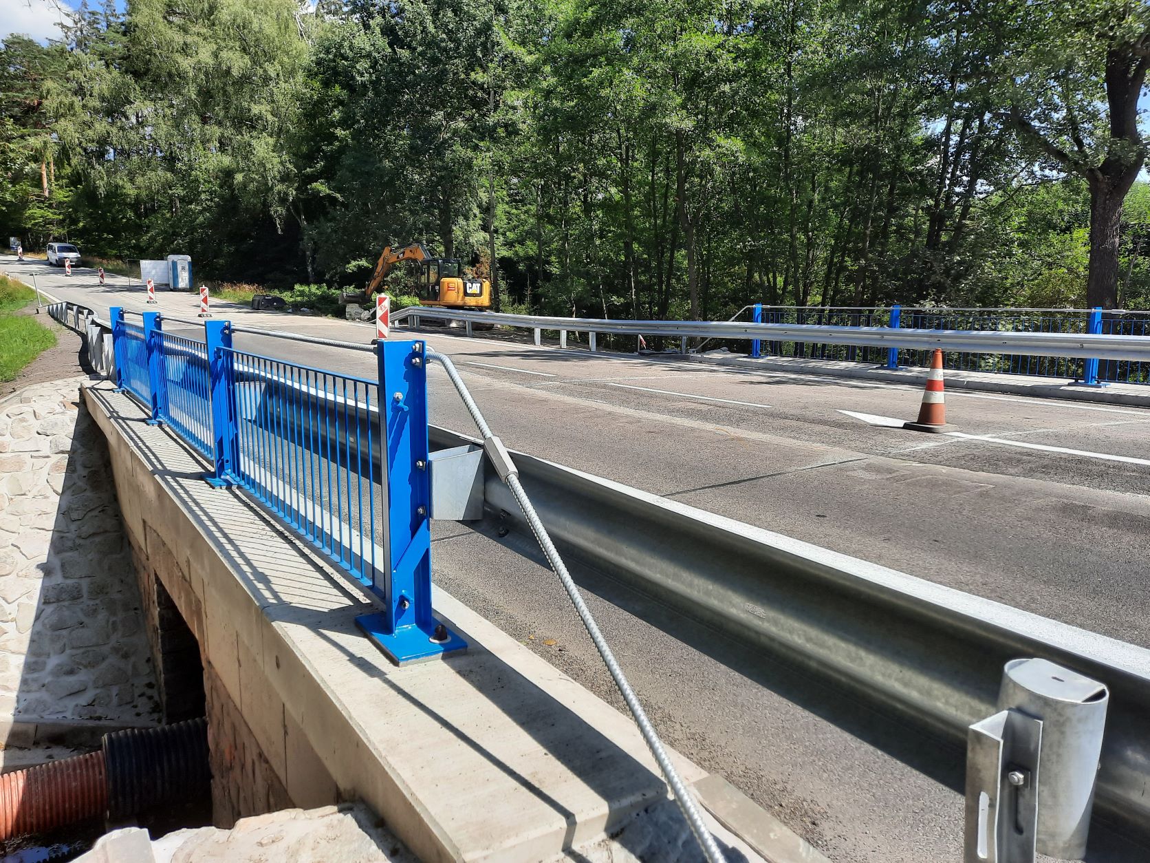 Dokončujeme opravu mostu ev.č. 19-076 u Radňovic na silnici I/19 mezi Novým Městem na Moravě a Žďárem nad Sázavou. Minulý týden jsme na mostě položili nové vozovkové souvrství, provedli zálivku spár, obnovili vodorovné dopravní značení, zpevnili krajnici a instalovali nová svodidla. V oblasti svahového kužele podél křídel mostu jsme osadili silniční obruby a zahájili dláždění svahu kamenem do betonu. Souběžně se dláždí odvodňovací skluzy zakončené vývařištěm a koryto toku pod mostem.
