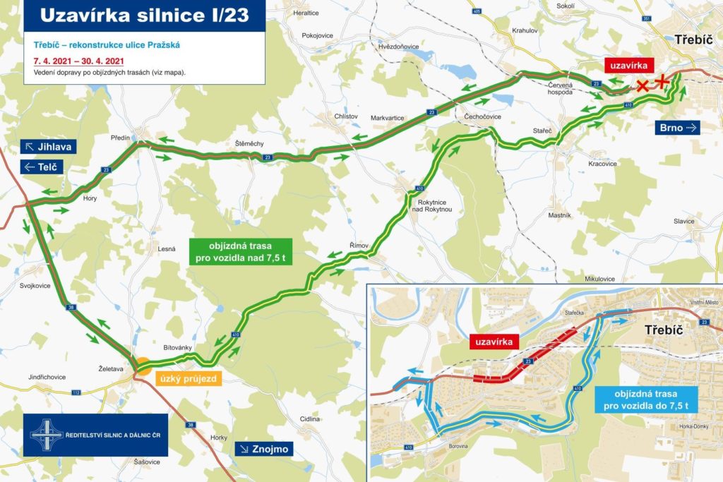 Práce jsou plánované do 2. etapa. V rámci každé z nich se bude opravovat jeden jízdní pruh. Druhý jízdní pruh bude vždy určen pro jednosměrné vedení dopravy z centra města. Ve směru do centra Třebíče budou vozidla do 7,5 jezdit po značené objízdné trase vedené po místních komunikacích. Těžká nákladní vozidla nad 7,5 tuny budou muset použít objízdnou trasu vedenou po silnicích I/23 a I/38 a dále mezi Želetavou a Třebíčí po silnici II/410, viz.mapa objízdné trasy